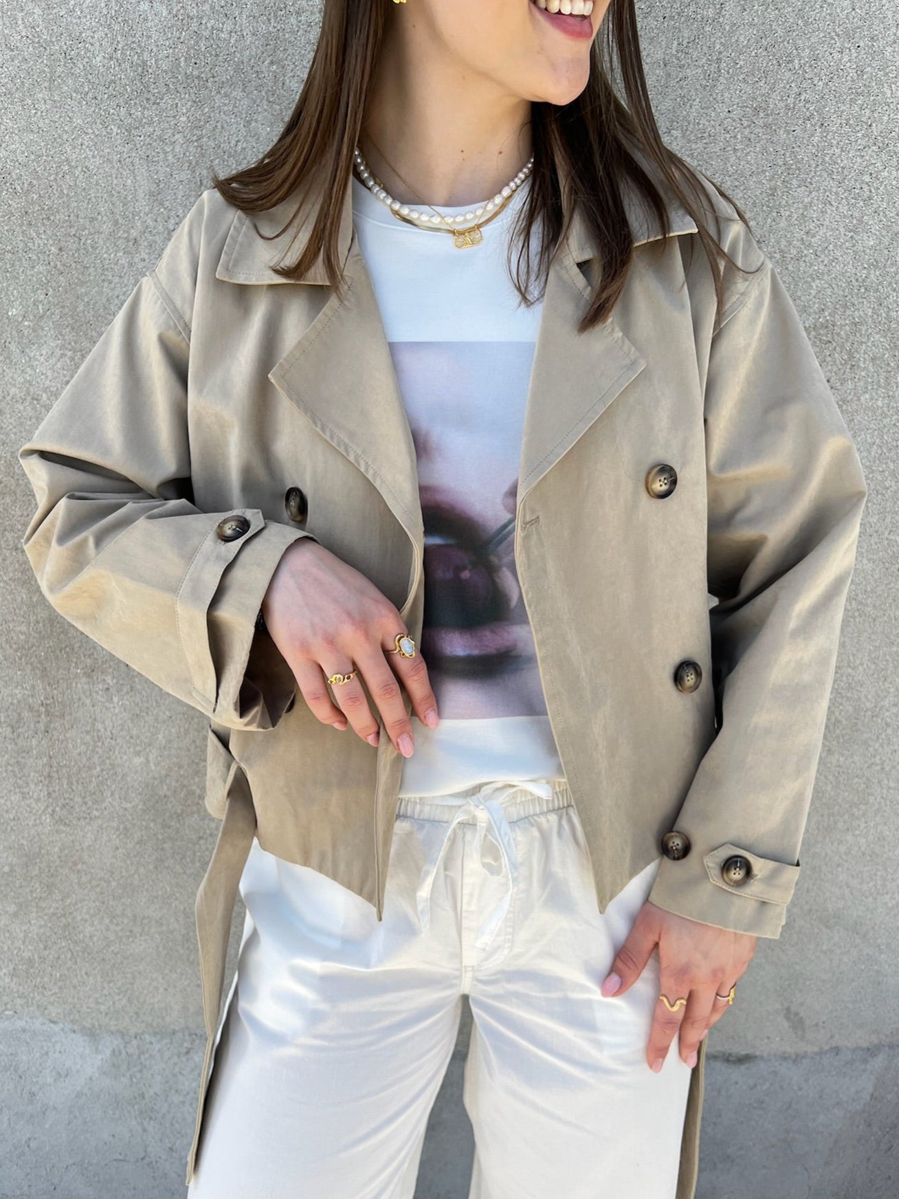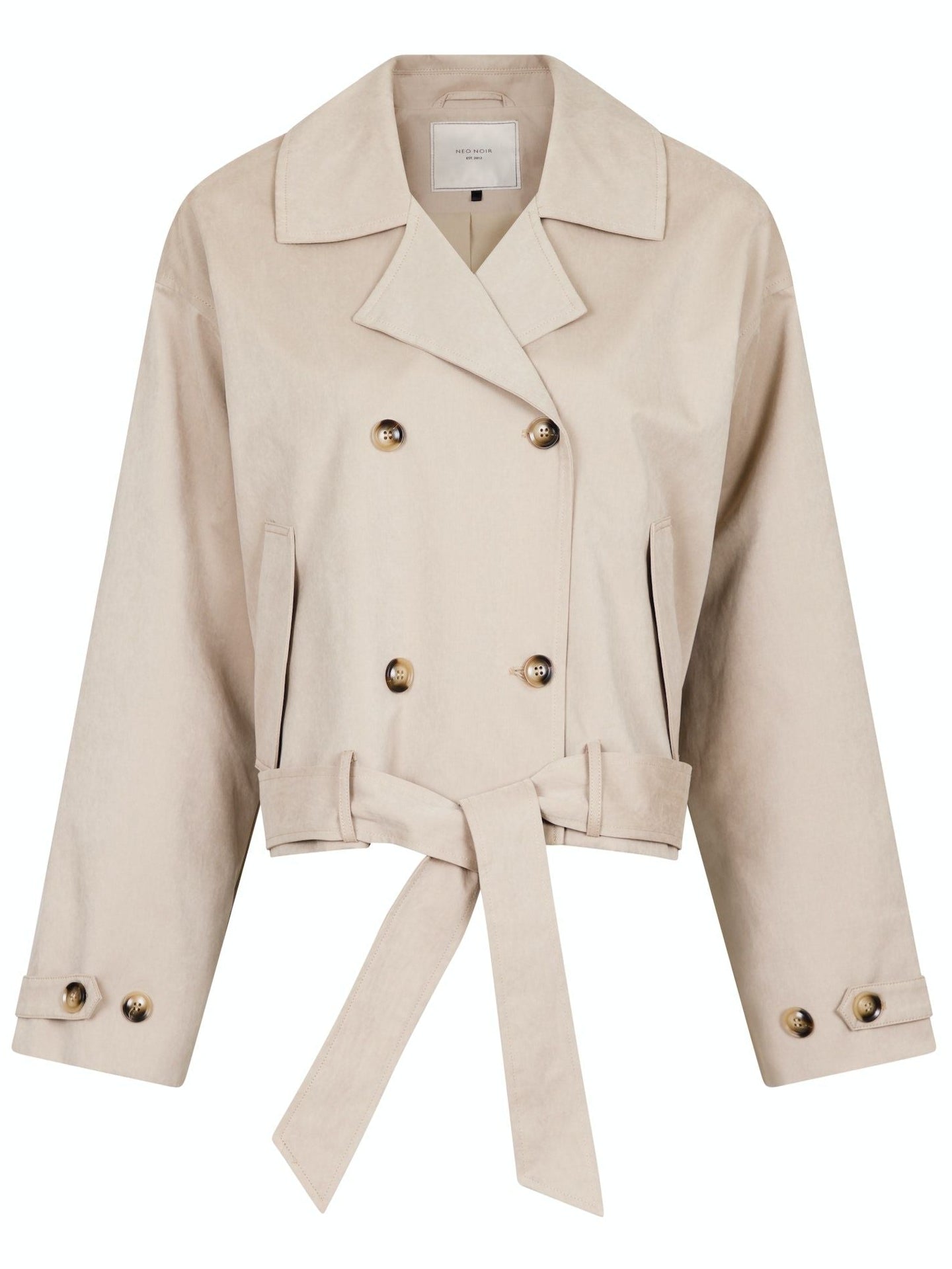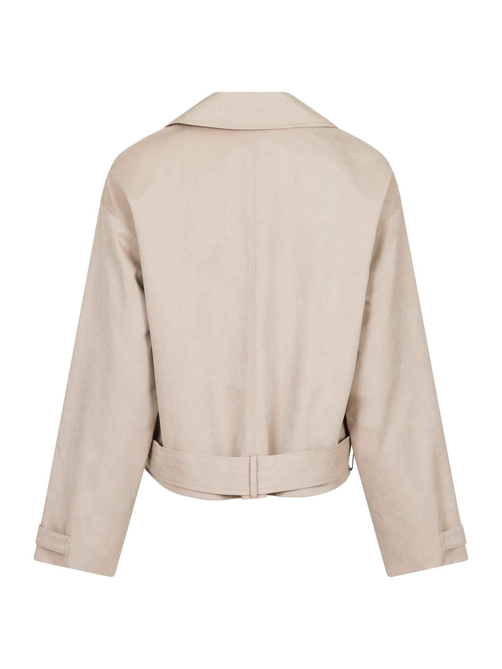 Smuk, kort jakke i sandfarvet, som er perfekt til foråret. Jakken har trenchcoat detaljer, da den er dobbeltradet med knapper, snapstrop og bælte. Desuden er det en kort model.