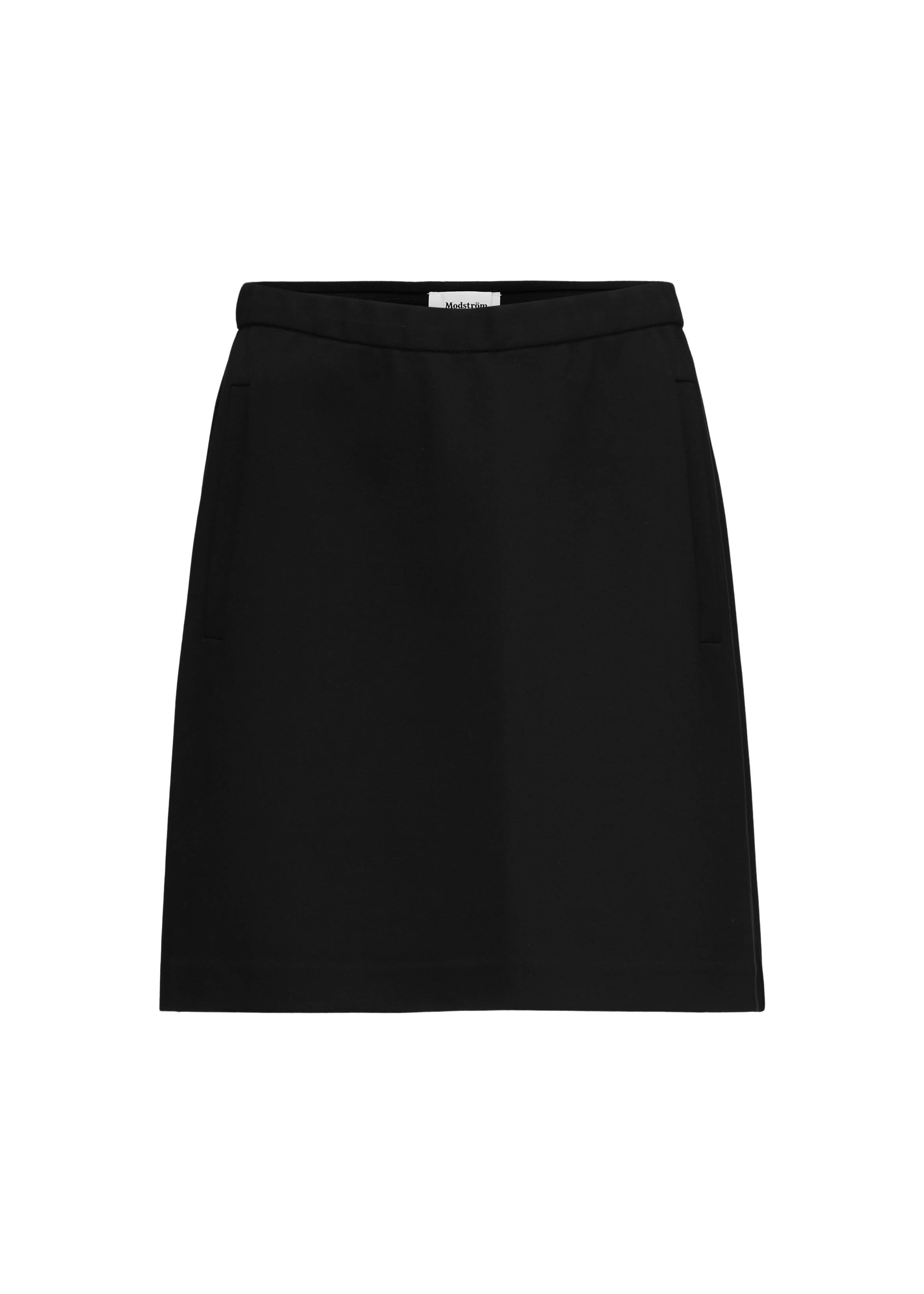 Sort, kort nederdel fra modstrøm i et enkelt og klassisk look. Nederdelens kvalitet er tæt og kraftig, hvilket sikrer, at den ikke er gennemsigtig. Der er elastik i taljen og masser af stretch i selve nederdelen for en god komfort. De lige snydelommer foran er en flot detalje.