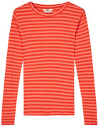 Rigtig fin langærmet basis bluse med koral/orange striber. Pasformen er tætsiddende med lange ærmer, samt rund halsudskæring.