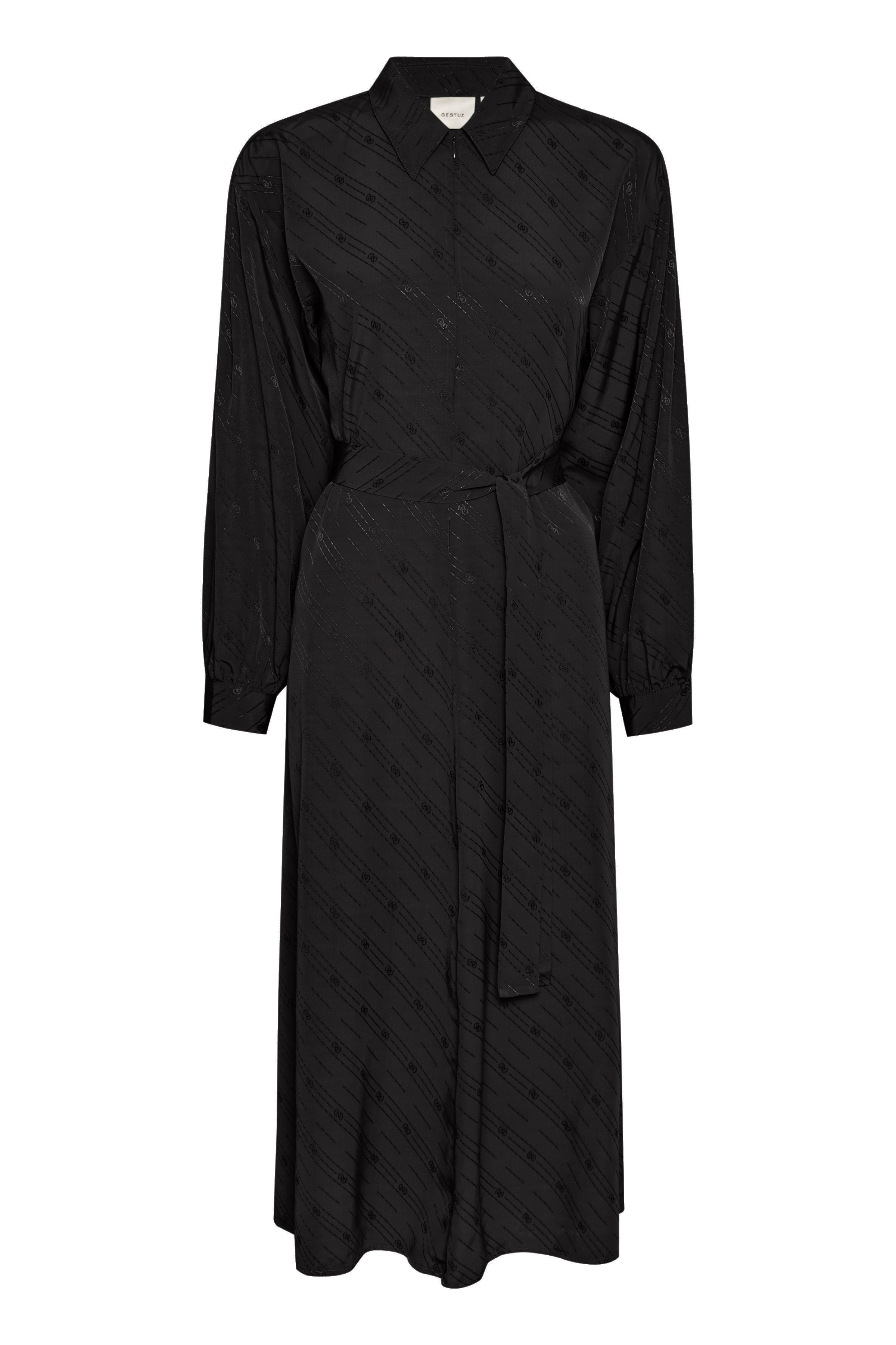 Utrolig smuk og enkel sort kjole fra Gestuz, der er et must i ethvert klædeskab. Kjolen har et lige snit, der går en anelse længere ud forneden, hvilket får den til at falde super flot. Kjolen har skjortekrave og de lange ærmer afsluttes med en lille knap. Foran er der en lynlås fra kraven og ned til under maven, hvilket gør kjolen amme-venlig. Lynlåsen kan lynes helt op, eller du kan lade den stå delvist åben og style med en top indenunder. Bindebånd medfølger. Det klassiske Gestuz logo er trykt på hele kjolen sammen med et fint mønster af streger.