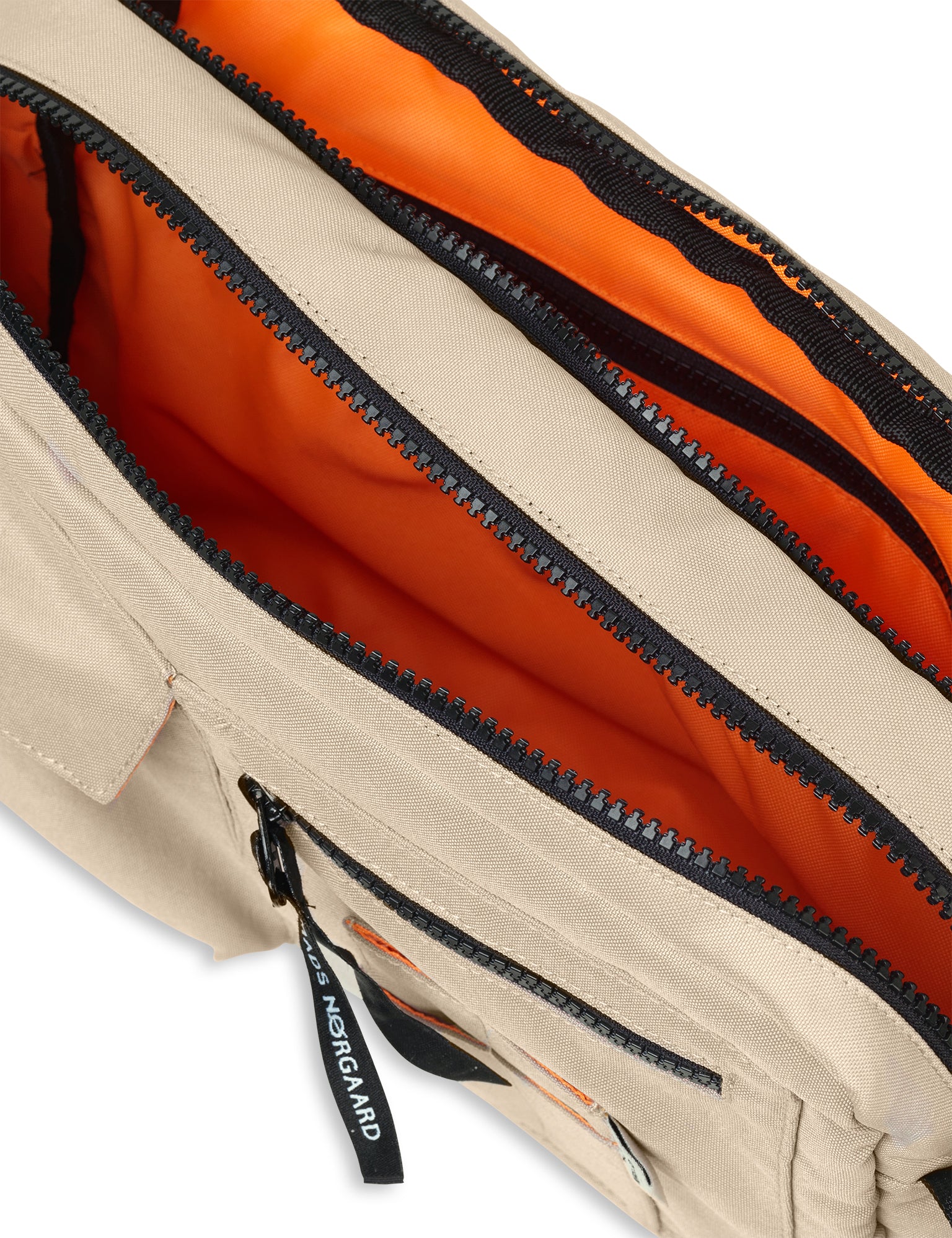 Super cool skuldertaske fra Mads Nørgaard i en beige farve. Tasken er rummelig og er derfor perfekt til at indeholde det mest nødvendige. Den har to store rum og gode opdelinger med ekstra lommer, så det er let at holde orden. Den er desuden forret med en sej orange.