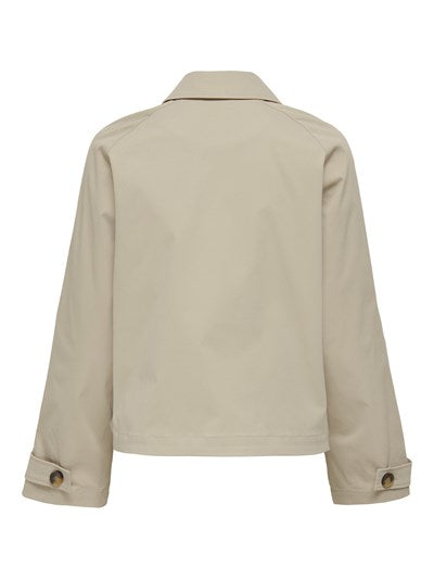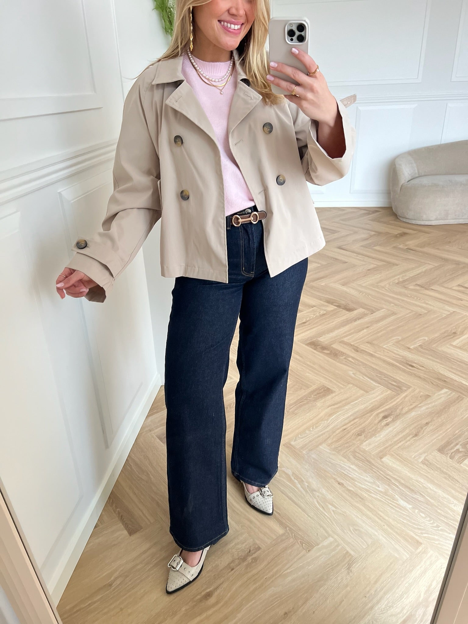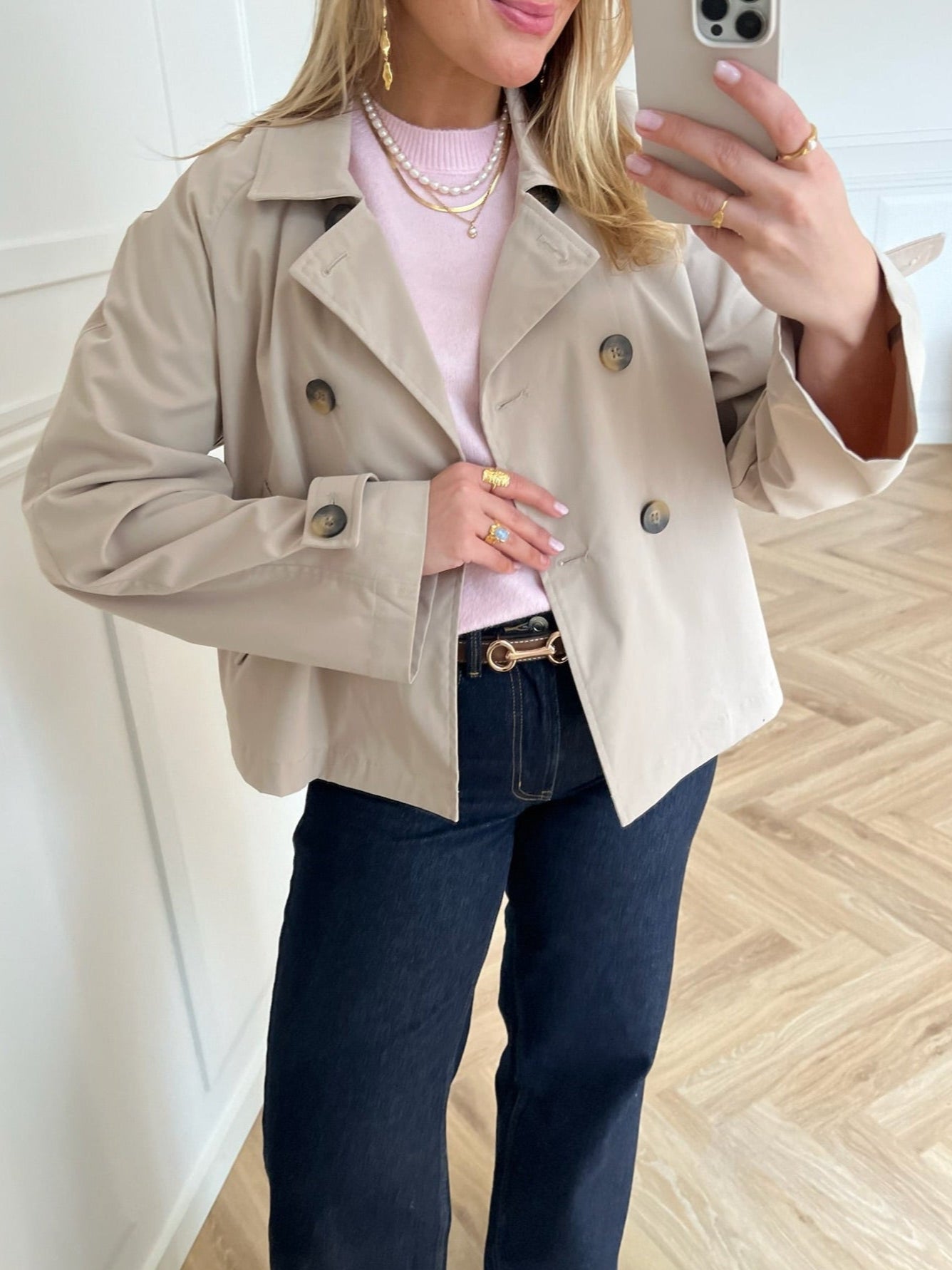 Super fin kort trenchcoat med fine detaljer. Jakken har seks knapper fortil, to lommer i siden samt knappedetalje på ærmet.