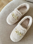 Lækre hjemmesko i blød plys med en forgyldt kæde som en smuk detalje. Skoene har bløde, flexible gummi såler og almindelig pasform.