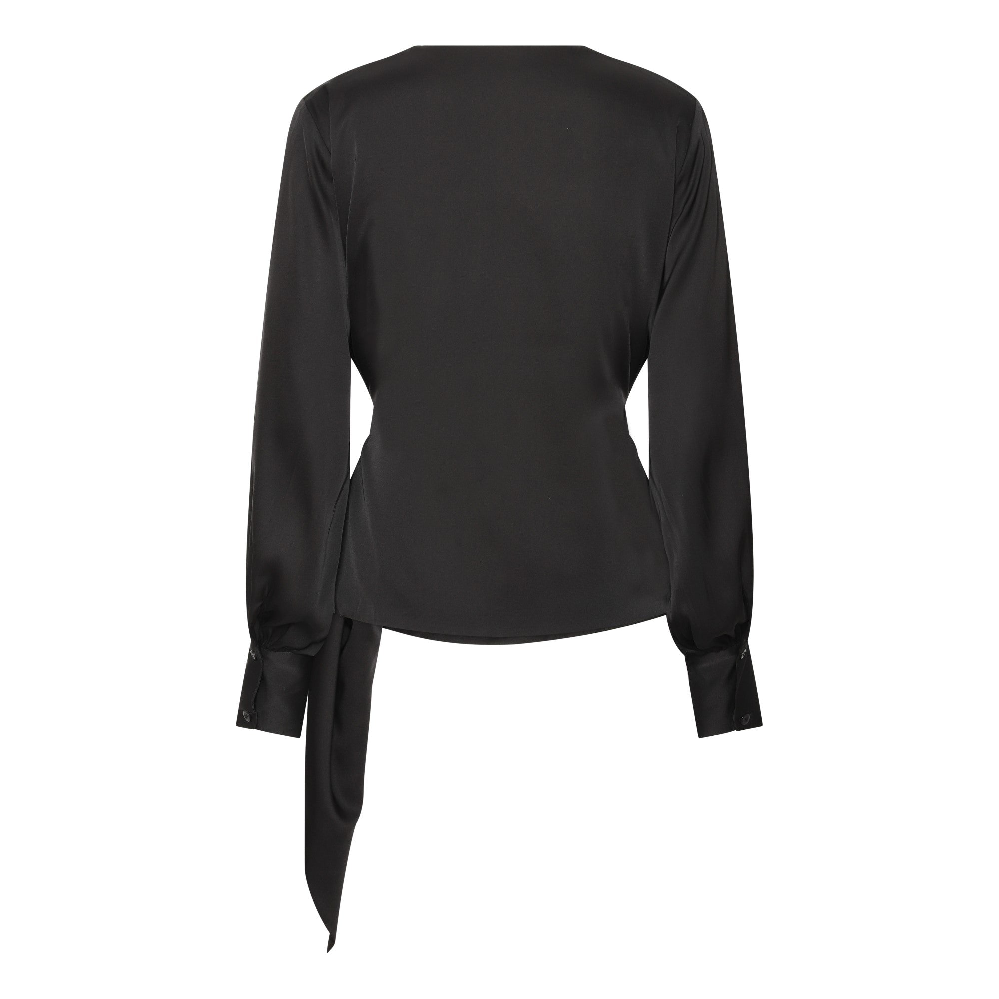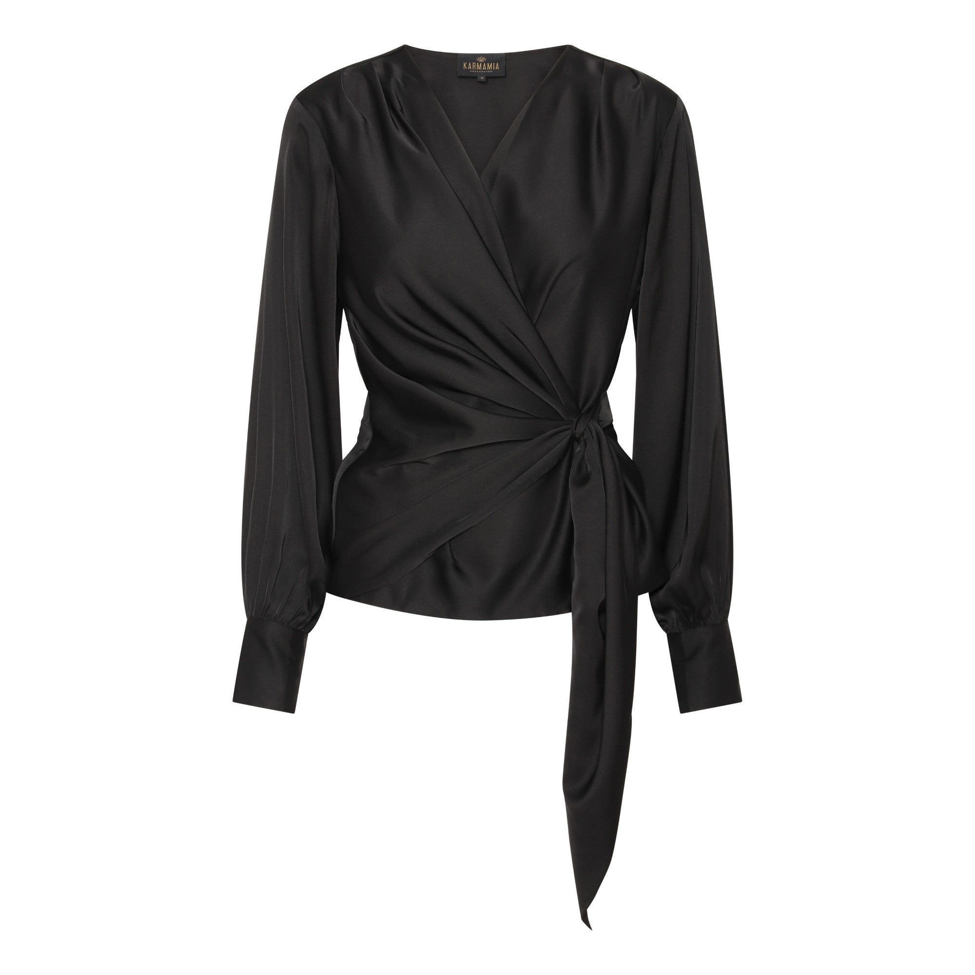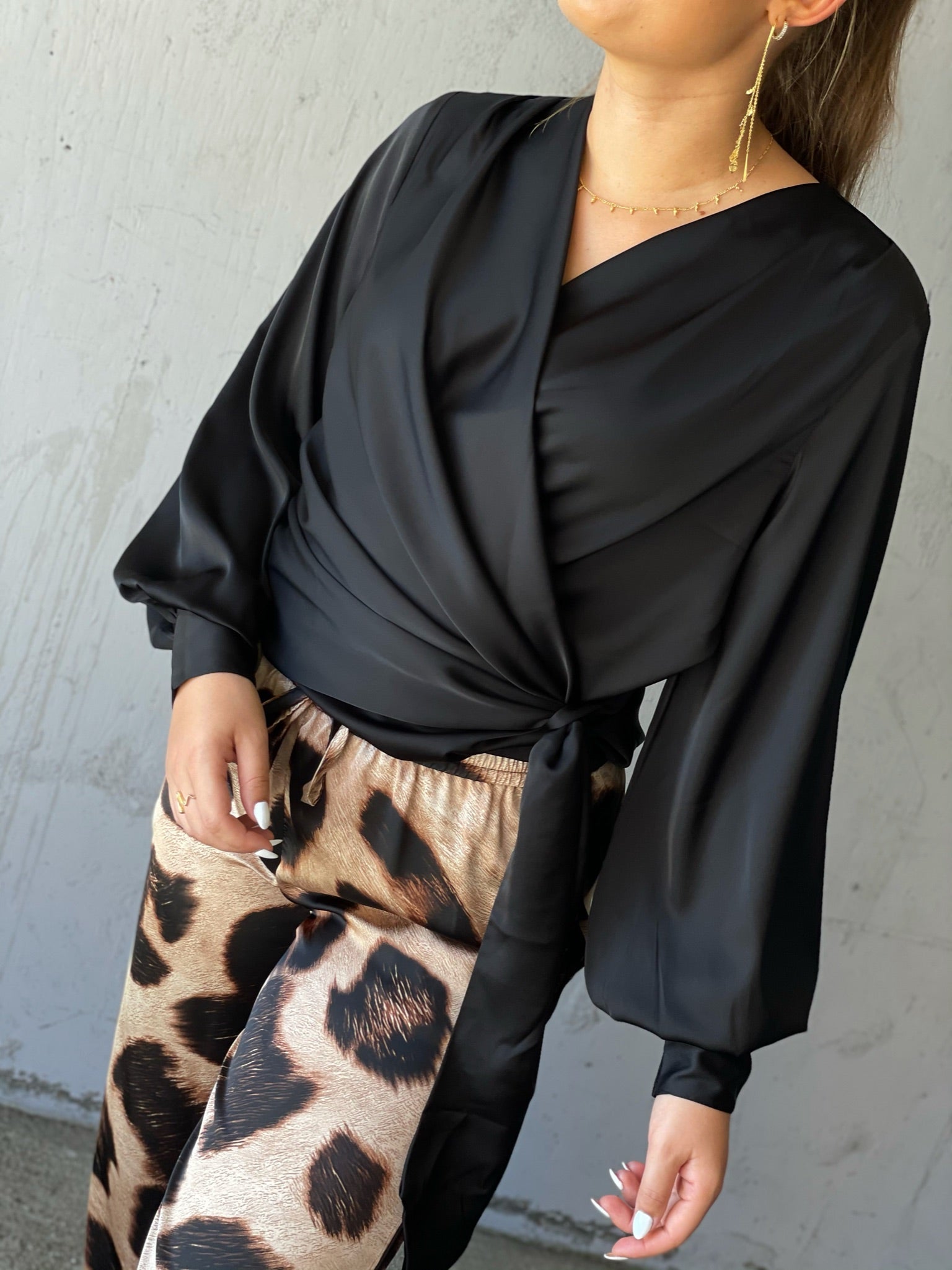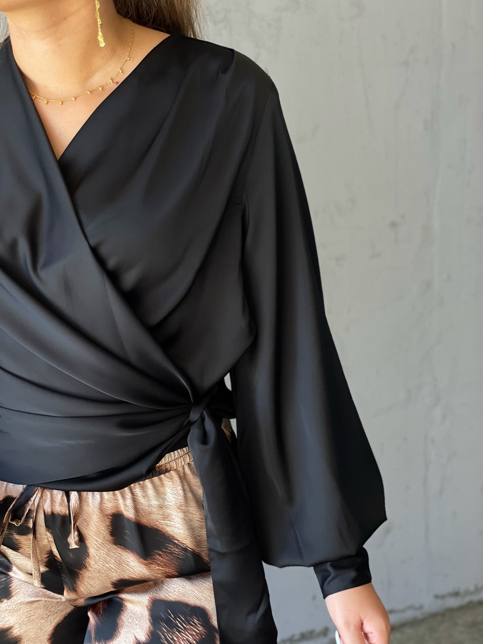 Slå-om bluse i den lækreste bløde satin kvalitet. Blusen har en flot drapering foran og en smuk udskæring. Flotte loose ærmer, som kan knappes med to sorte knapper. Blusen bindes i venstre side. Se mere fra Karmamia Copenhagen her.