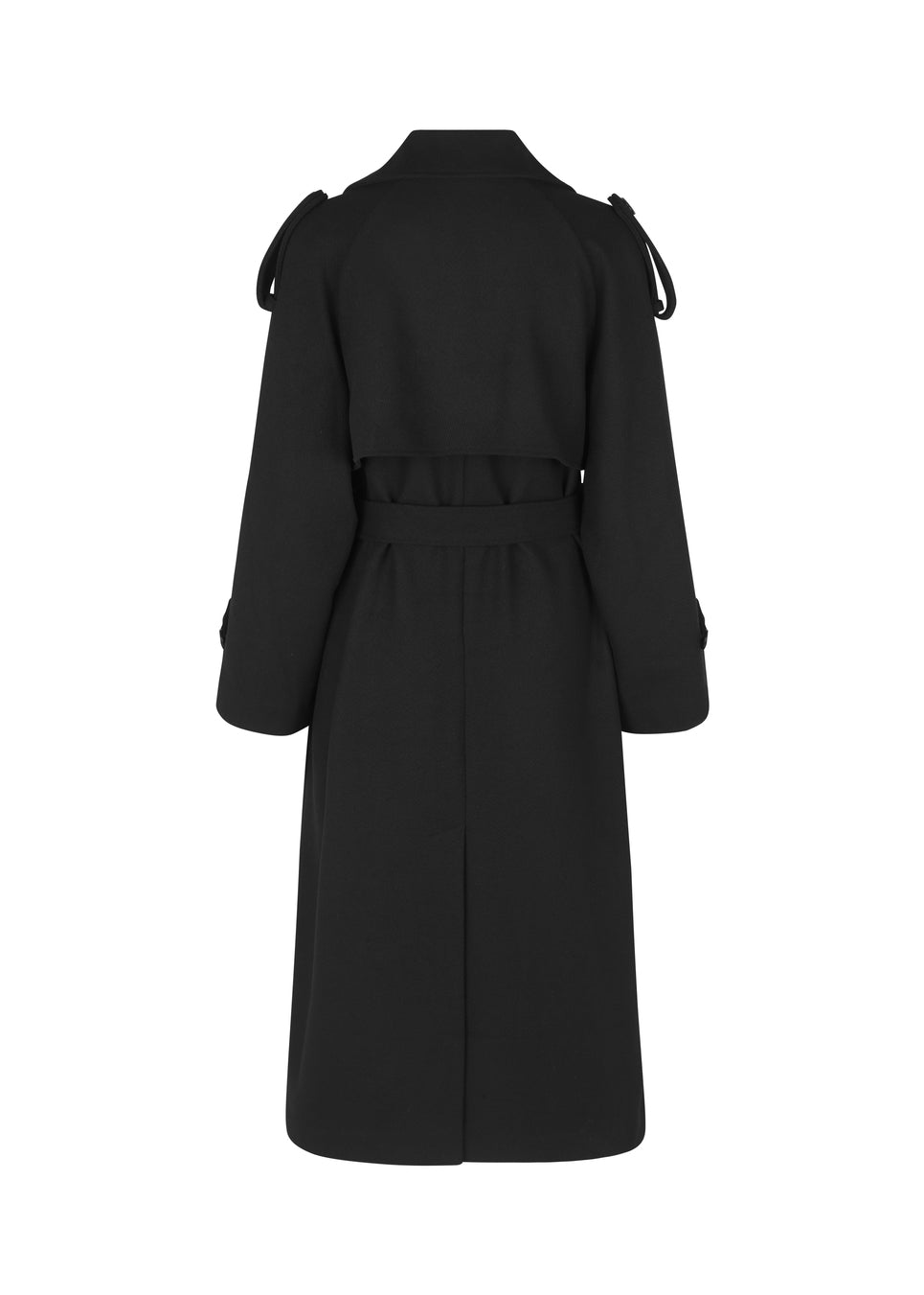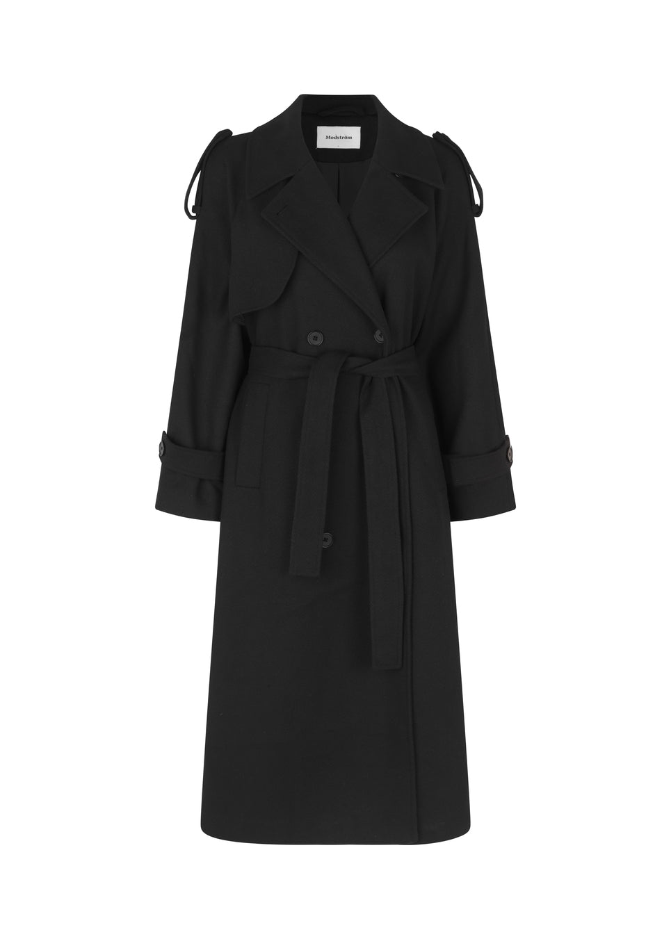 Borak er en utrolig smuk frakke i trenchcoat-stil fra Modström. Frakken har oversized pasform, slids bagpå og bindebælte. Den lukkes med en dobbeltradet knaplukning og har desuden en stor krave. Ved skuldrene samt nederst ved ærmet er der skønne detaljer. Frakken er produceret i en lækker uld-blanding med foer, hvilket giver den et eksklusivt udtryk.