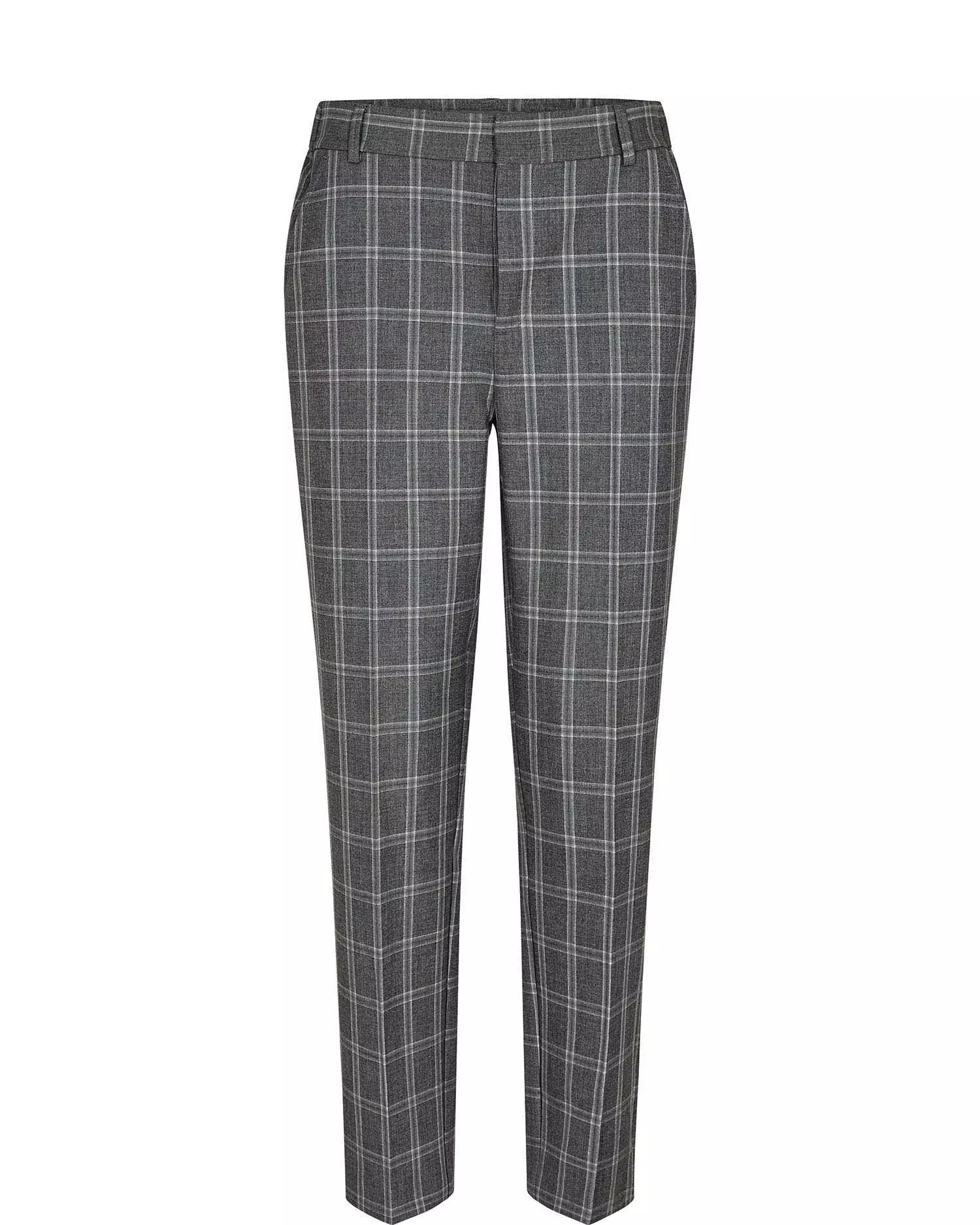 Super lækre habitbukser fra Mos Mosh i et smukt, ternet mønster i grå nuancer. Bukserne har lige pasform, linning, skrålommer og pressefolder. De er flotte et style til hverdag med en strik eller en skjorte. Desuden er de flotte og elegante at bruge som et suit sammen med den matchende Wanda Alen Blazer.