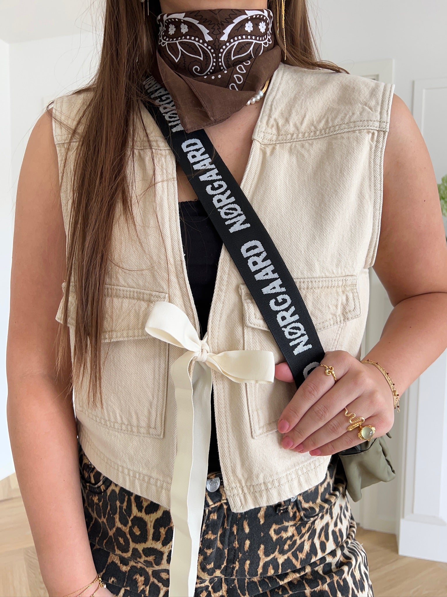 Super cool kort denim vest i en flot cremefarve. Vesten har bindebånd foran, som kan bindes til en sløjfe samt to lomme foran.