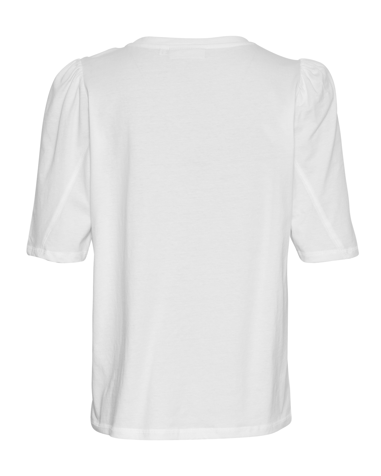Flot og enkel T-shirt fra Moss Copenhagen i 100% økologisk bomuld. T-shirten har lige pasform, rund hals samt trekvartlange ærmer. Ærmerne har skønne detaljer i form af en puf-detalje ved skuldrene og en rå syning ned langs armen. Denne udgave er i en klassisk hvid og du finder den i andre farver her.