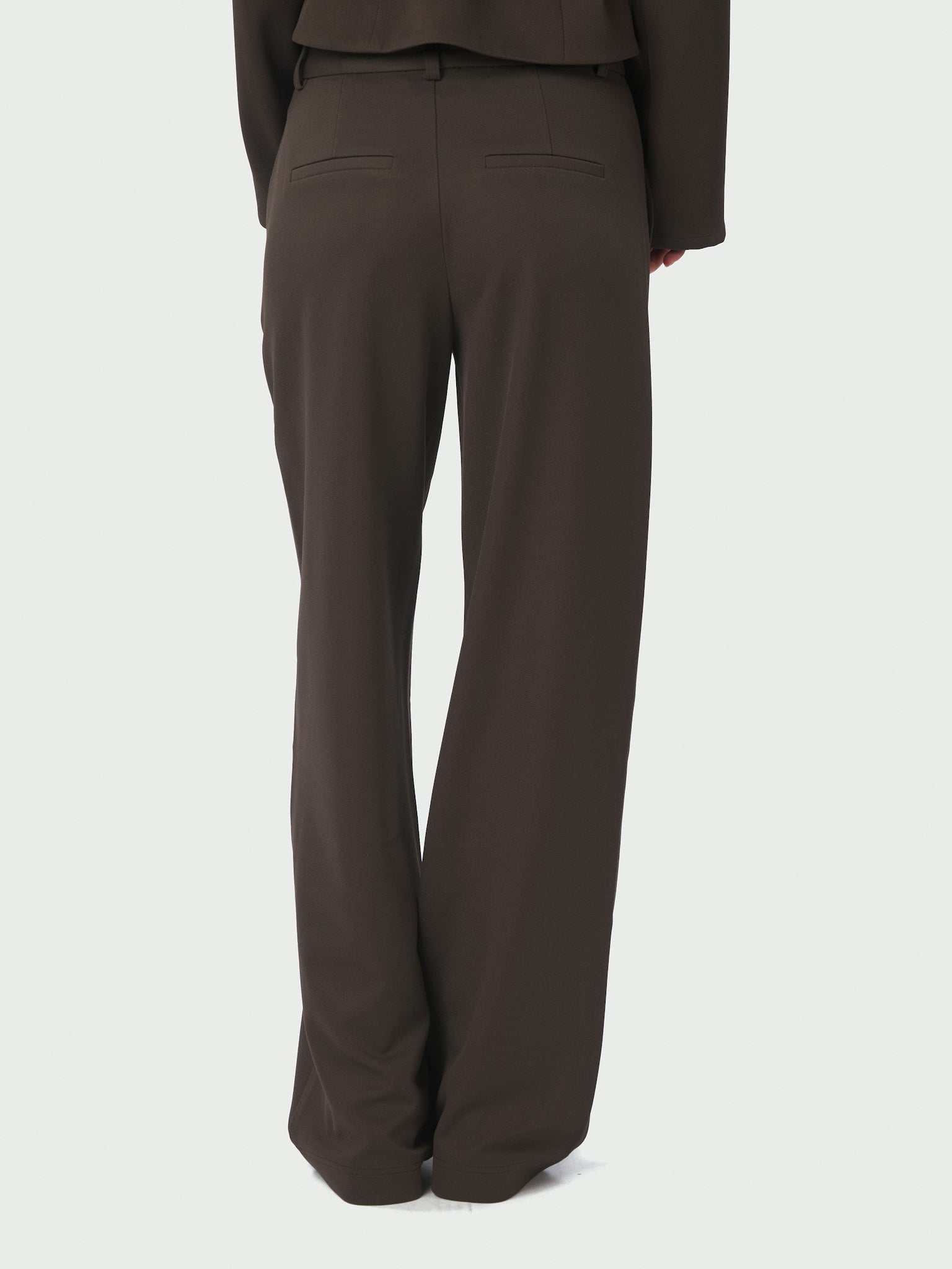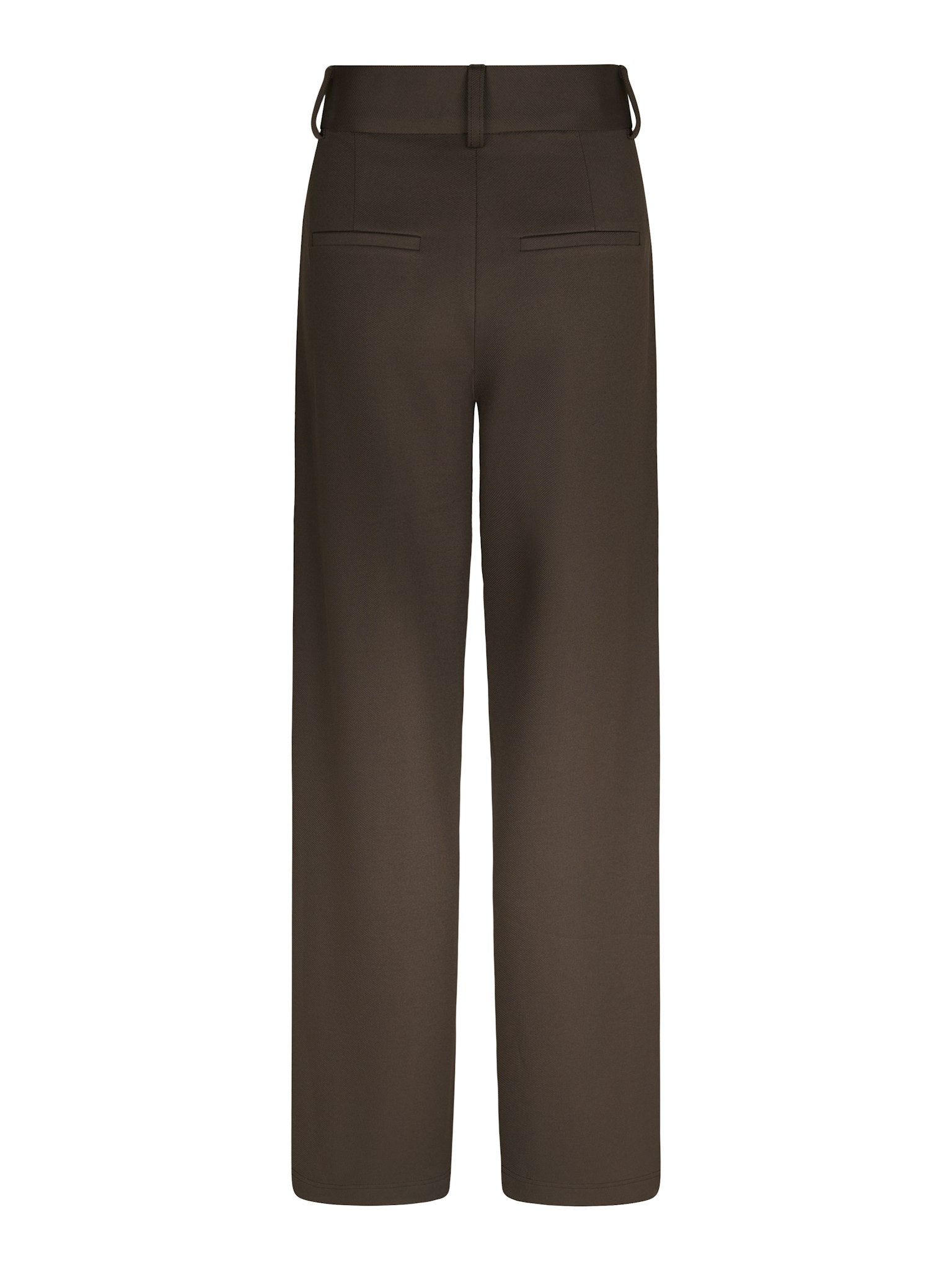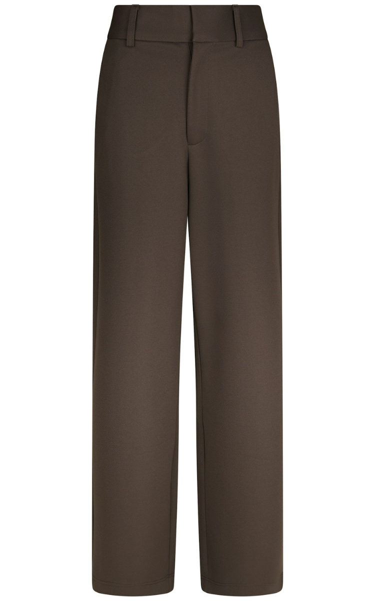 Disse Nathalie bukser har en høj talje, der giver et elegant og moderne snit. Den mørkebrune farve skaber en alsidig base, der er nem at style til både hverdag og mere formelle lejligheder.