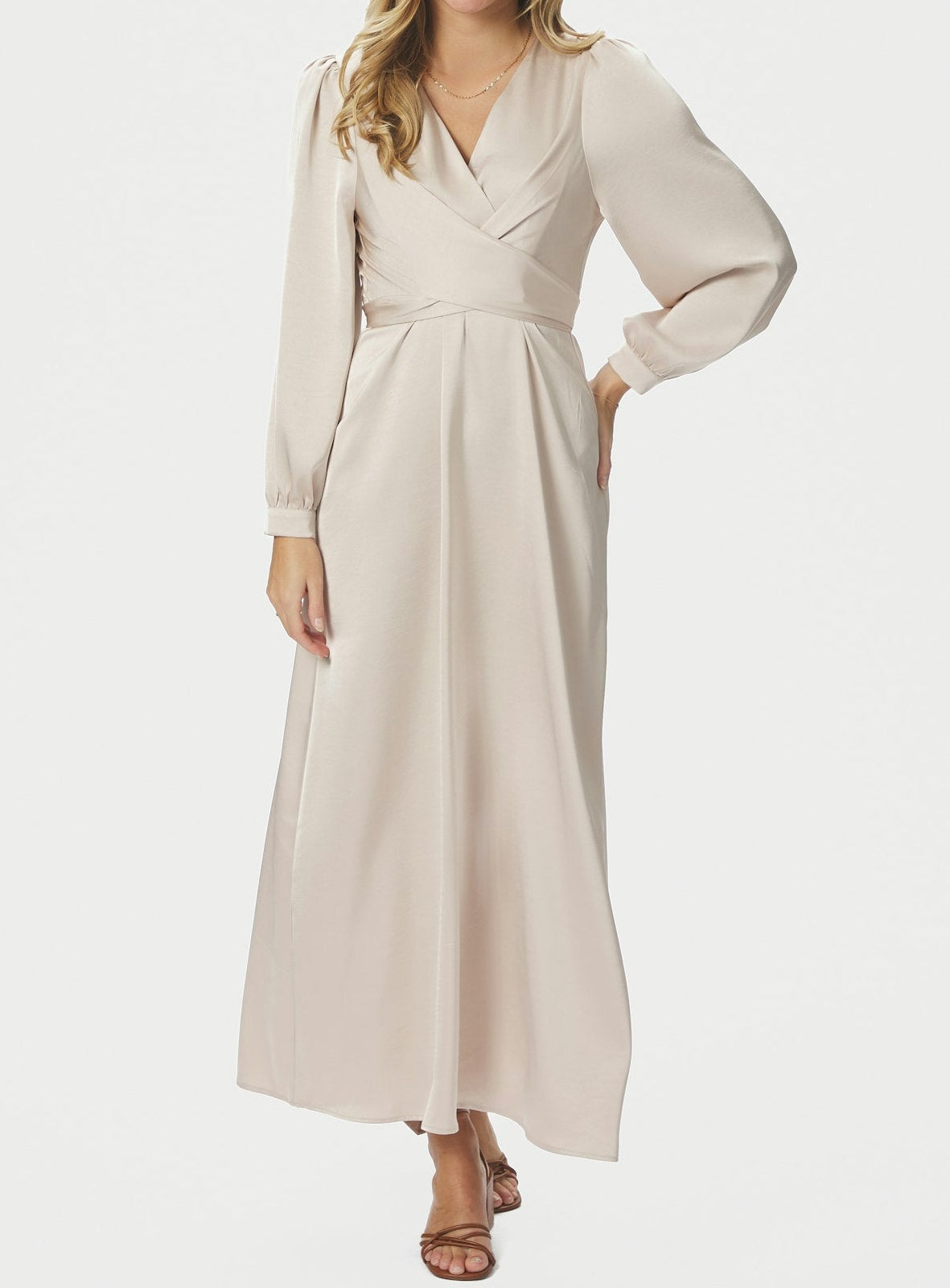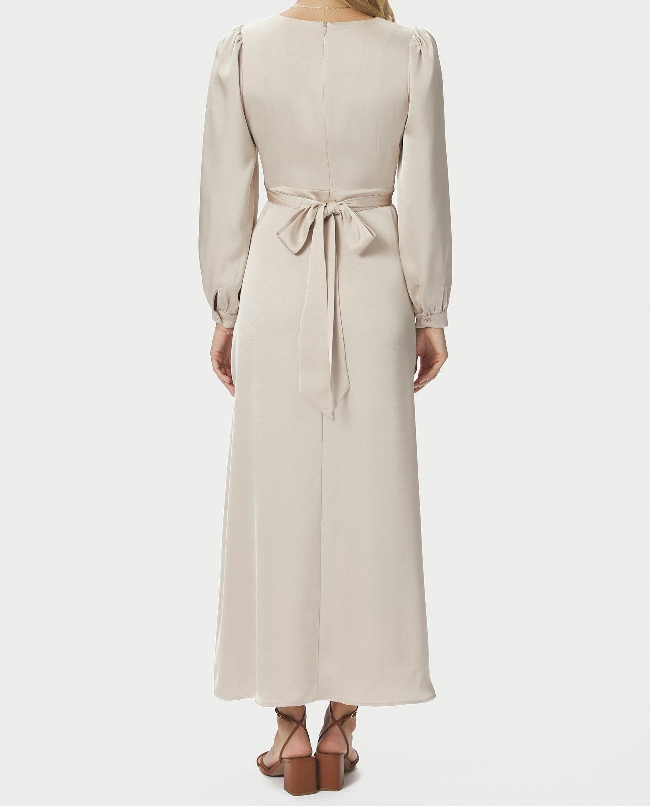 Denne kjole i tung satinvævning falder elegant og komfortabelt med sine lange ærmer.
