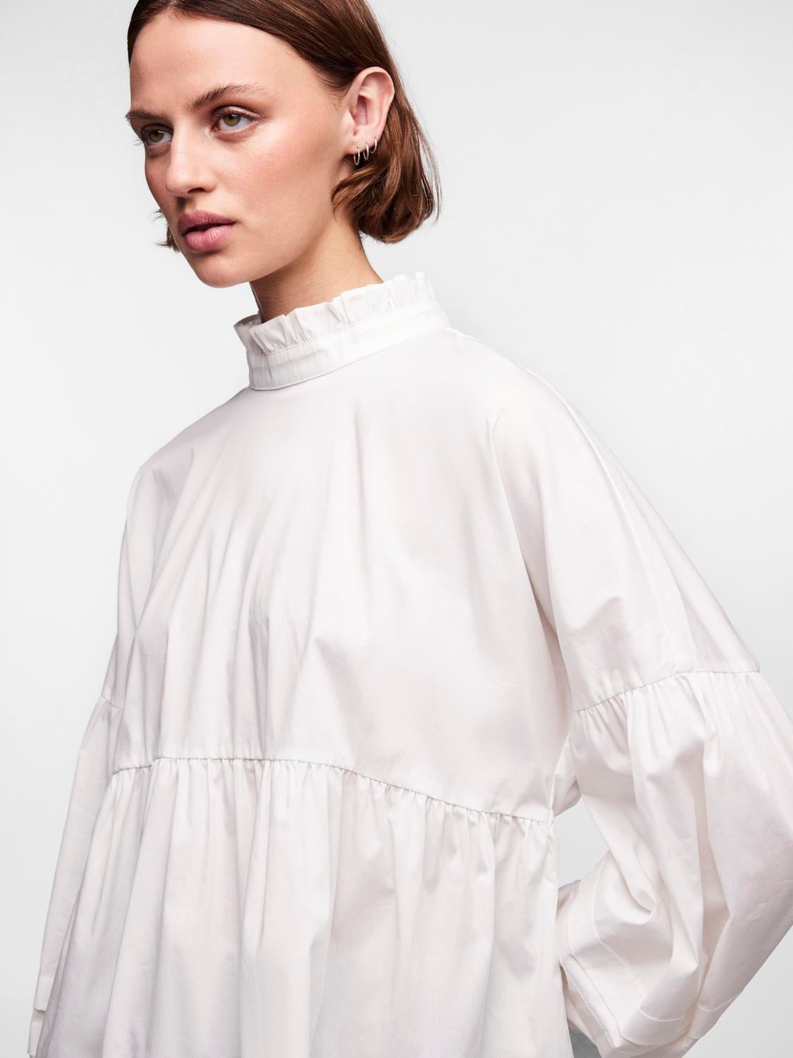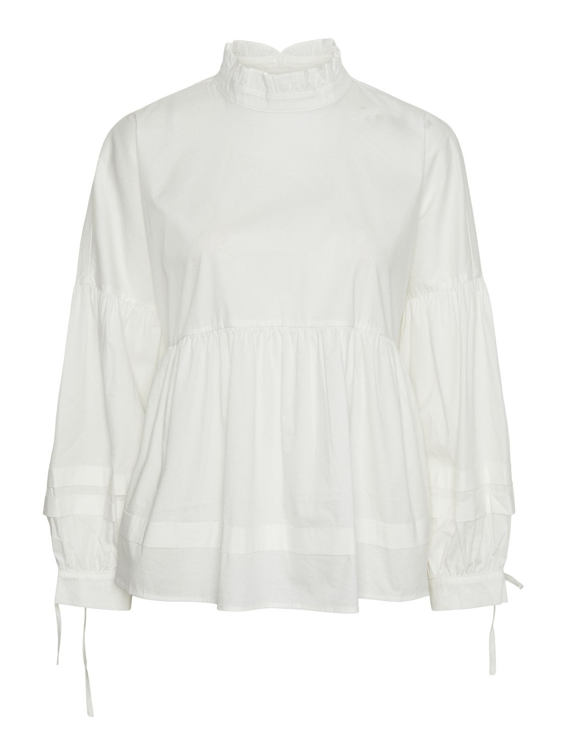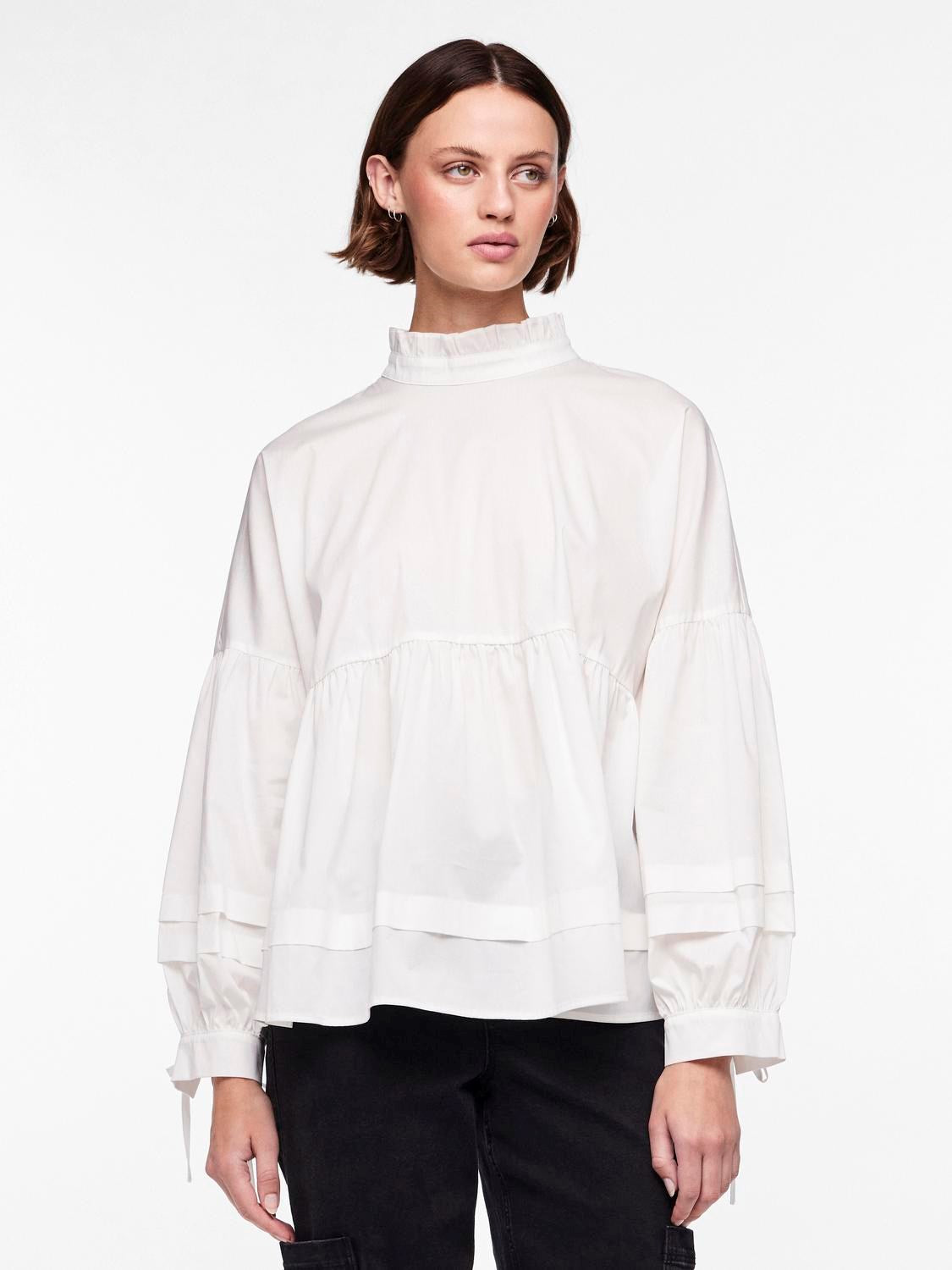 Smuk langærmet hvid skjorte fra Pieces. Skjorten har mange flotte detaljer, såsom rynkeeffekt ved halsen, brede ballonærmer, snører ved ærmerne og et snit tværs over maven. Derudover har den en bred pasform. Perfekt til hverdagen, men kan også styles til mere festlige lejligheder.
