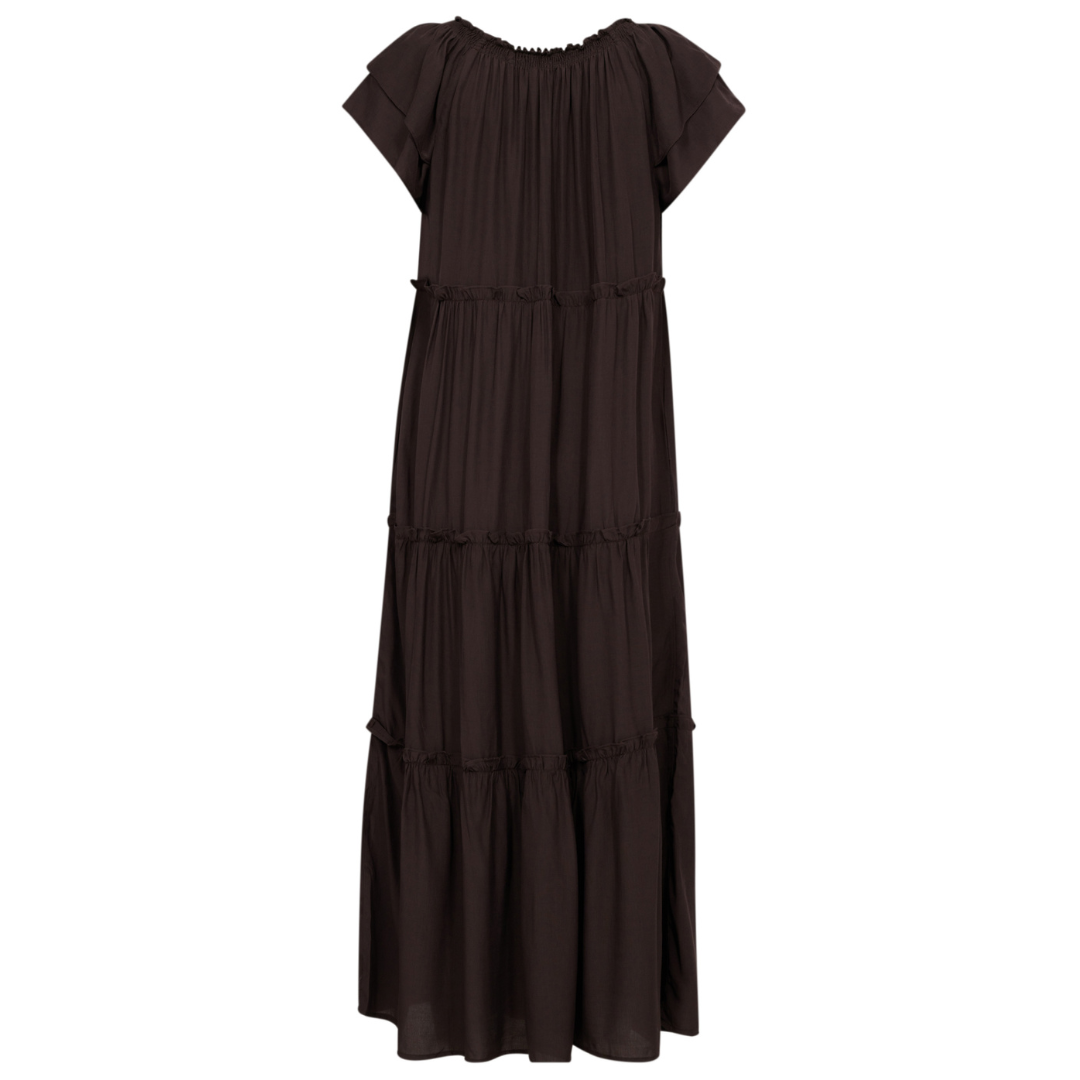 Flot, lang kjole med flæser og overskæringer. Kjolen har korte ærmer og en lav v-udskæring. Den er fremstillet i en blanding af polyester og viskose, hvilket gør den super behagelig at have på.