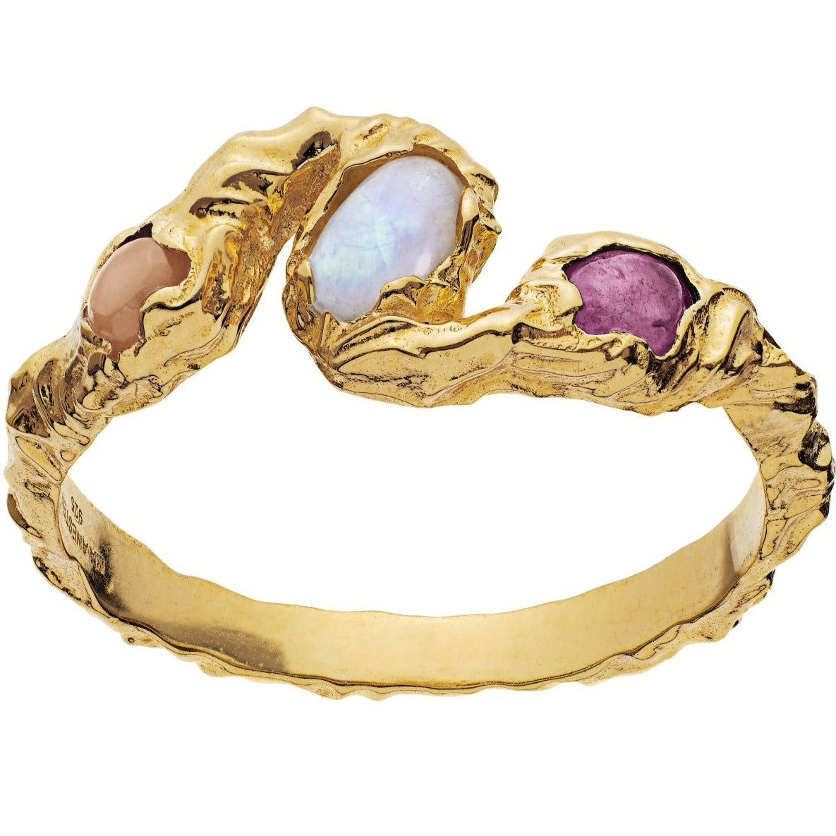 Baila er en smuk ring med et skinnende finish. Den har indfattede sten i rosa nuancer, organiske former og en banket overflade. Denne skaber tilsammen et feminint og moderne udtryk.
