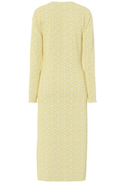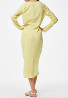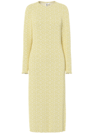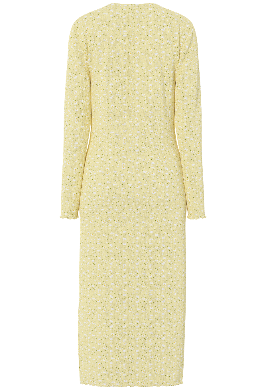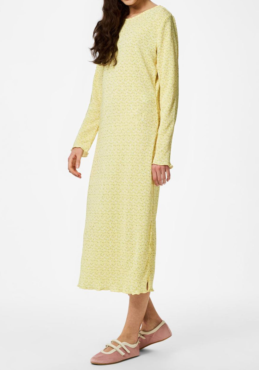 En slim fit plissékjole med lange ærmer og rund hals. Kjolen har knapper foran og et blomstret all-over print i en lys gul nuance.