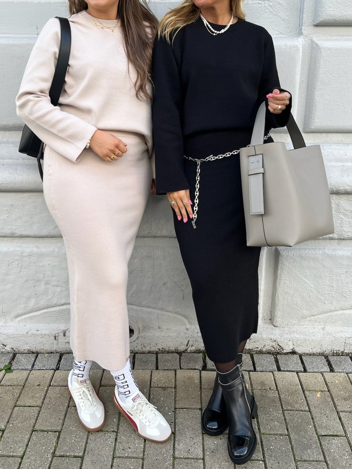 Smuk lang nederdel fra Object. Nederdelen er lavet i et tykt strikmateriale, hvilket er passende til de mere kolde måneder. Nederdelen har en tyk ribkant ved taljen, og et kort slids bagpå. Desuden er der stretch i, således den sidder pænt.
