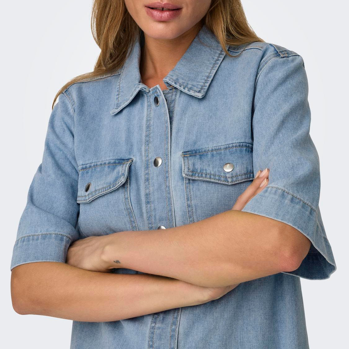 En kort denimkjole med skjortekrave og 2/4 ærmer, der giver et afslappet og moderne look. Kjolen har en trykknapslukning og brystlommer med trykknap, hvilket tilføjer funktionalitet uden at gå på kompromis med stilen.