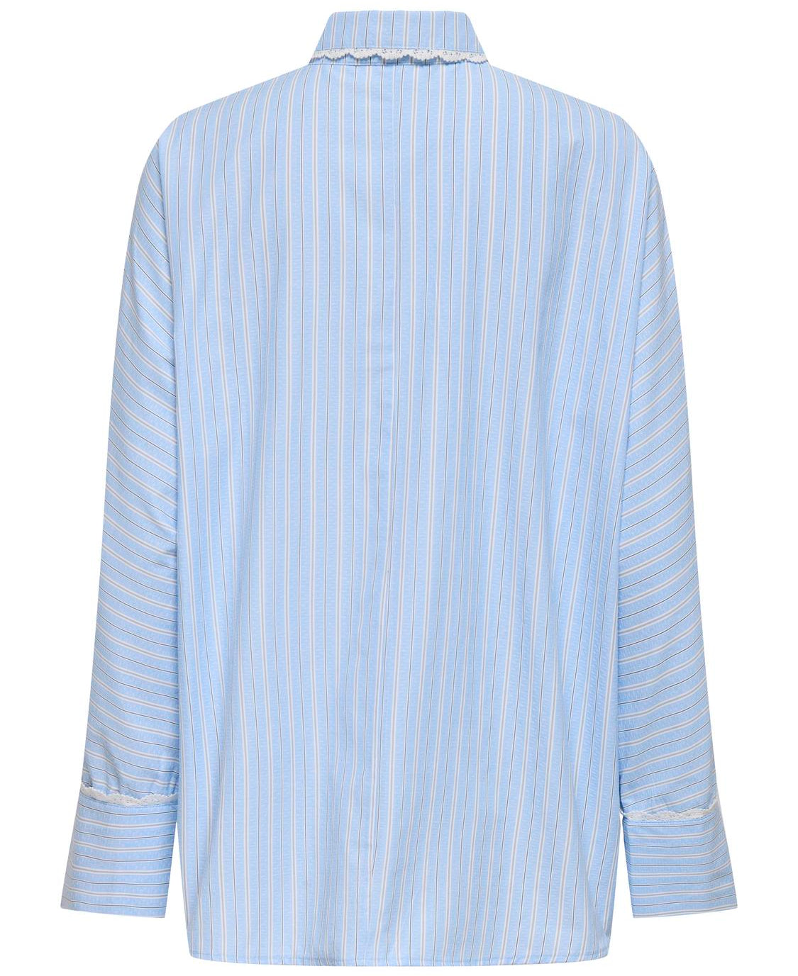 Denne bluse i den karakteristiske stribede vævning kombinerer et klassisk udtryk med fine blonde-detaljer, der tilfører et feminint touch. Den har en afslappet pasform med lange ærmer og en traditionel skjortekrave, som giver et tidløst og elegant look.