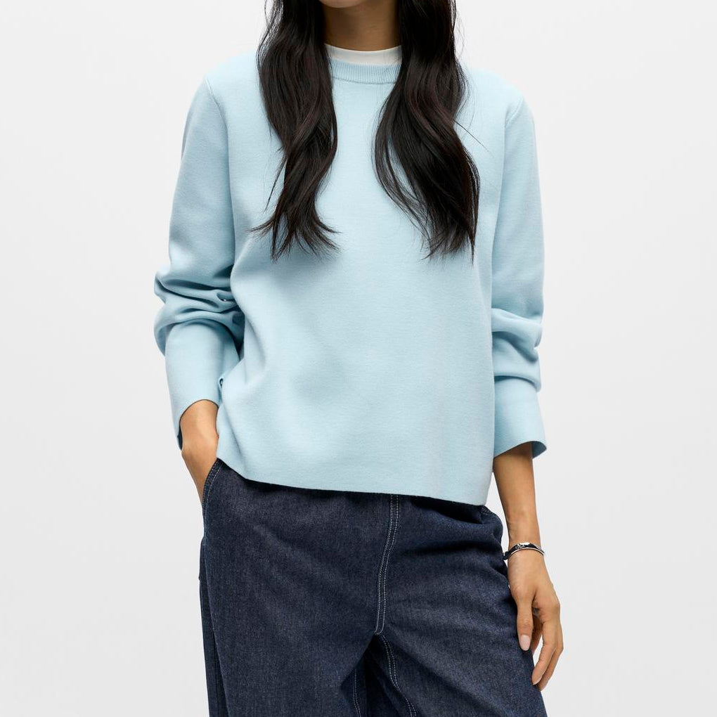 Denne strik med rund hals er designet med en løs pasform og brede, lange ærmer, der giver et afslappet og behageligt look. Strikken har en lys blå nuance, der gør den nem at kombinere med både jeans og mere festlige nederdele, så du kan bruge den året rundt.