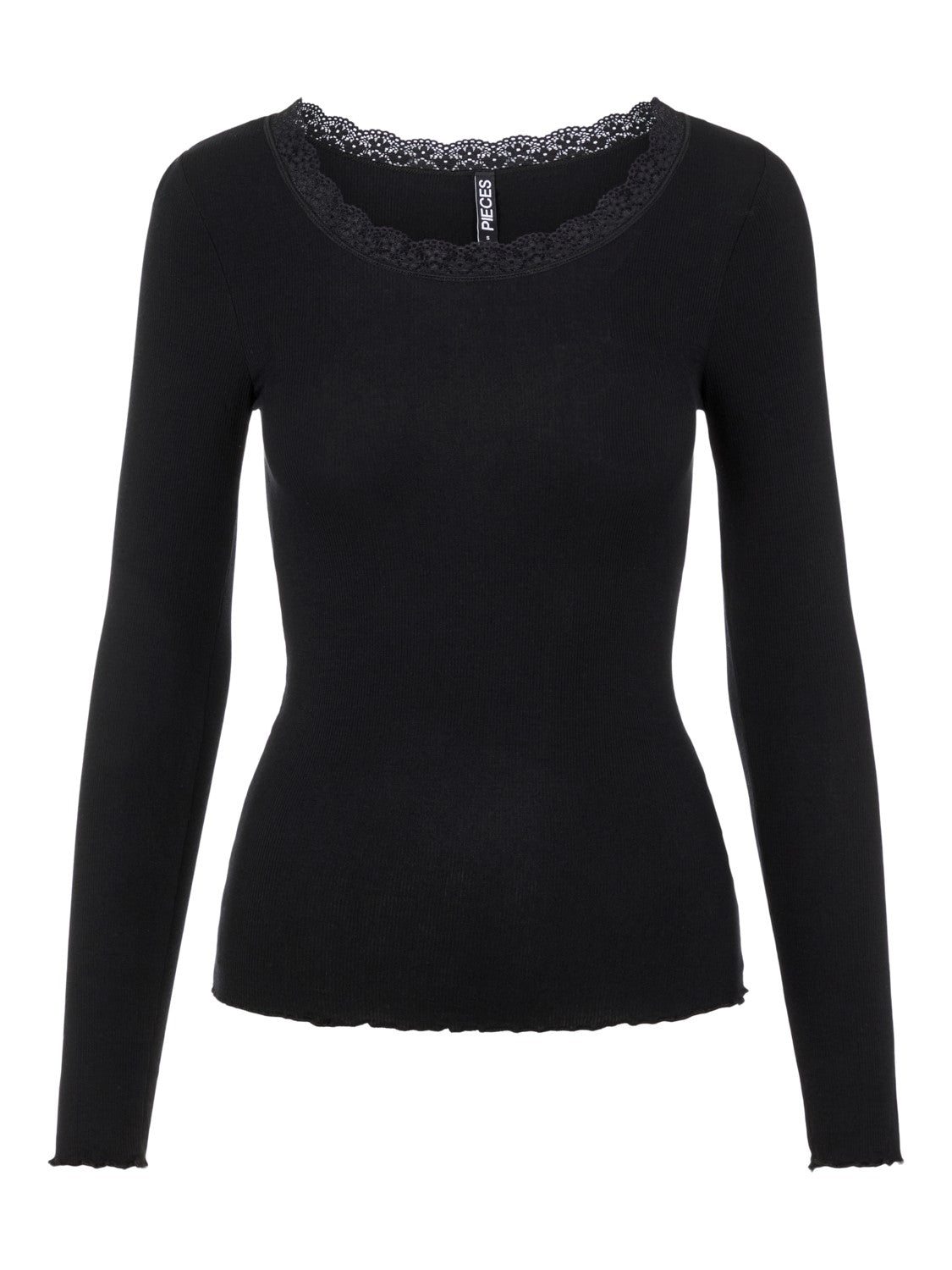Super sød basisbluse i en klassisk sort med blonder. Blusen har tætsiddende pasform og rund halsudskæring med en flot blondedetalje, der indrammer toppen på fineste vis. Den er yderst behagelig at have på og er perfekt indenunder en strik, en cardigan eller en blazer. En findes også i en råhvid udgave lige her.