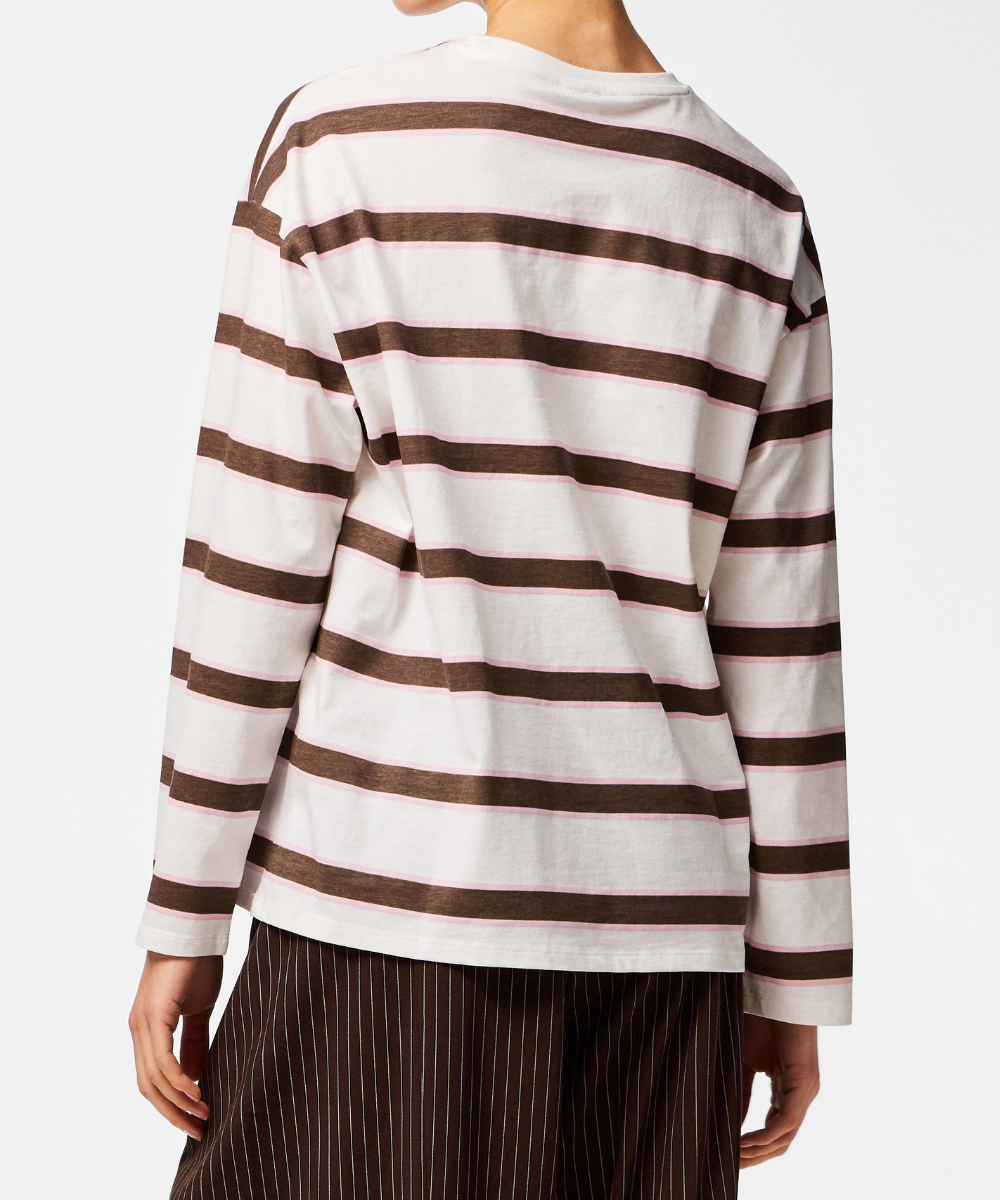 Denne løstsiddende t-shirt har en rund halsudskæring og lange ærmer, hvilket gør den ideel til afslappede og casual looks i forårssæsonen. Den lette stribede struktur tilføjer et diskret mønster, der giver et friskt og roligt udtryk i en blød rosa nuance.