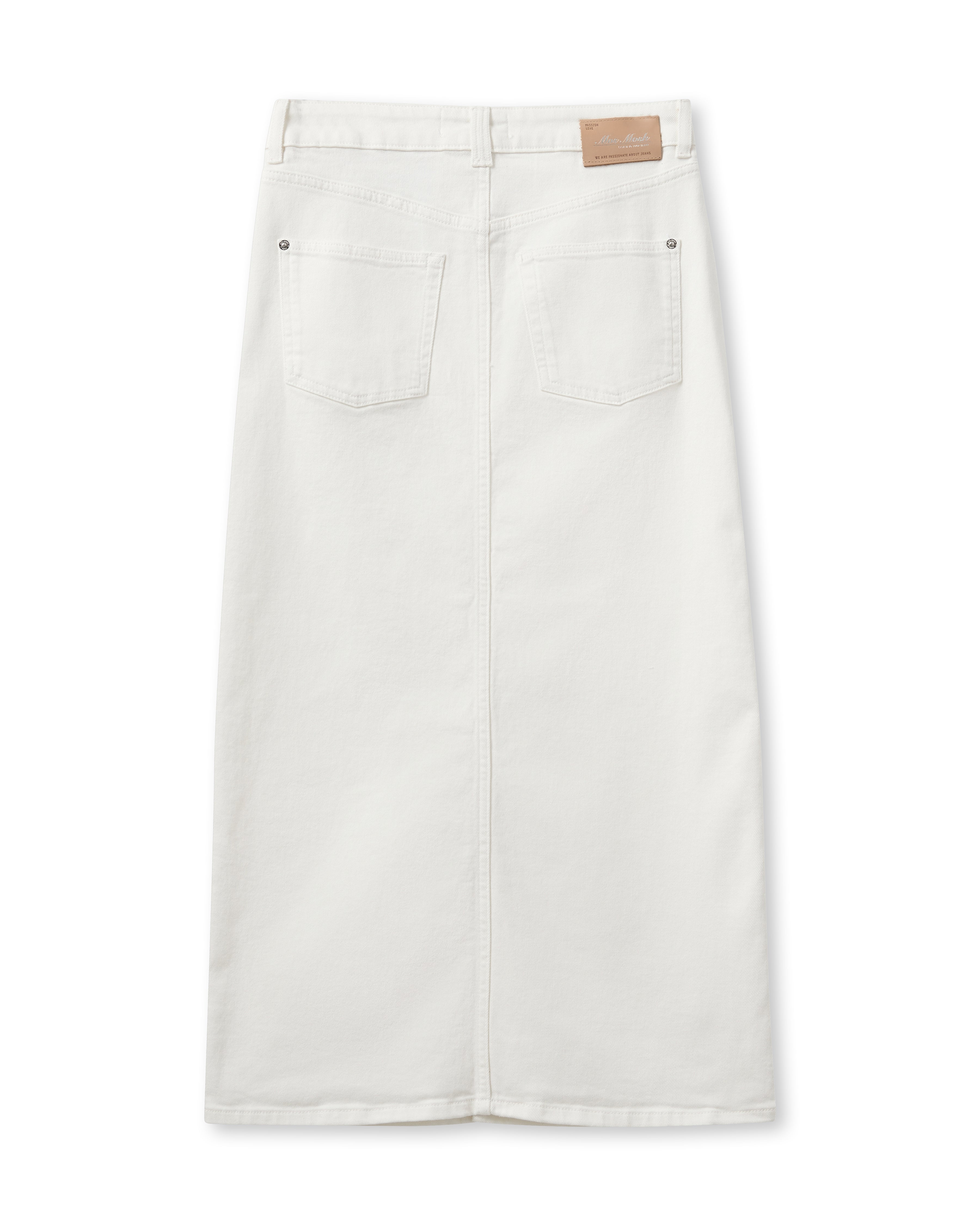 Smuk denimnederdel i en hvid udgave. Nederdelen har stræk samt almindelig pasform med linning, lynlåslukning og bæltestropper. Derudover har den en slids foran som en lækker detalje.