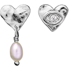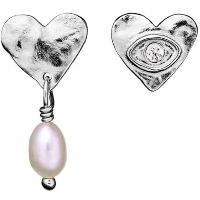 Dette fine sæt fra Maanesten består af to forskellige øreringe. De består begge af en hammerslået ørestik formet som et hjerte. Den ene ørering består derudover af et øje med en lille hvid zirkon, mens den anden består af et vedhæng med en ferskvandsperle.