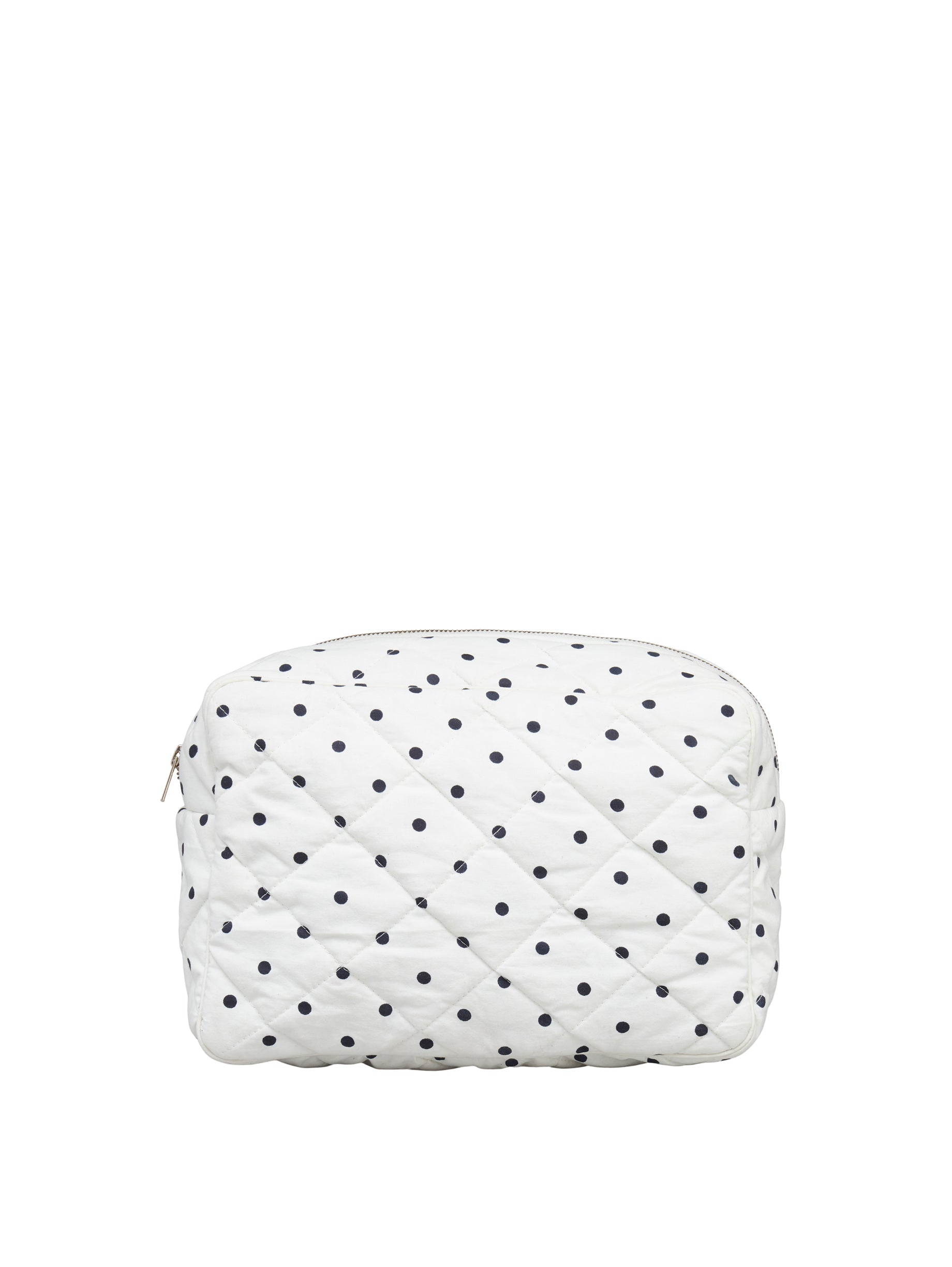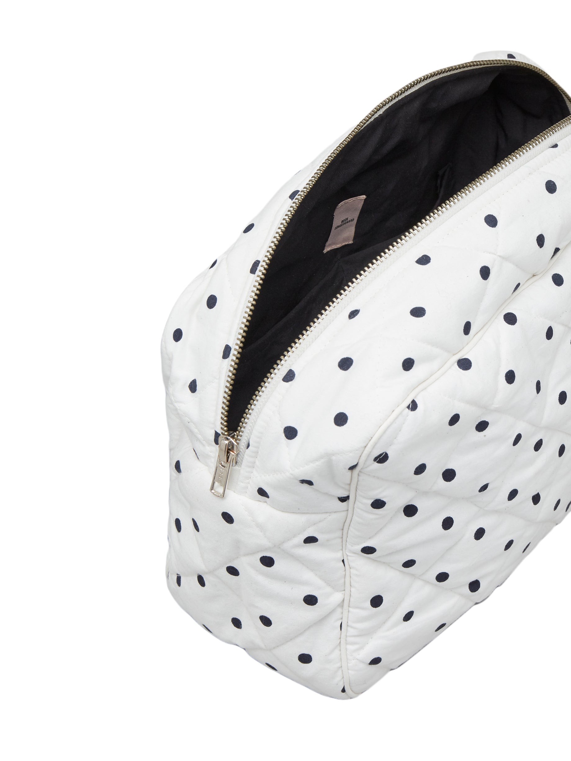 Dot Malin er en simpel og skøn toilettaske, med ét stort rum, som kan rumme det meste. Desuden har den små lommer indvendigt, der gør det let at holde orden. Toilettasken har råhvid bund og prikker i marine blå. Se vores øvrige toilettasker her.