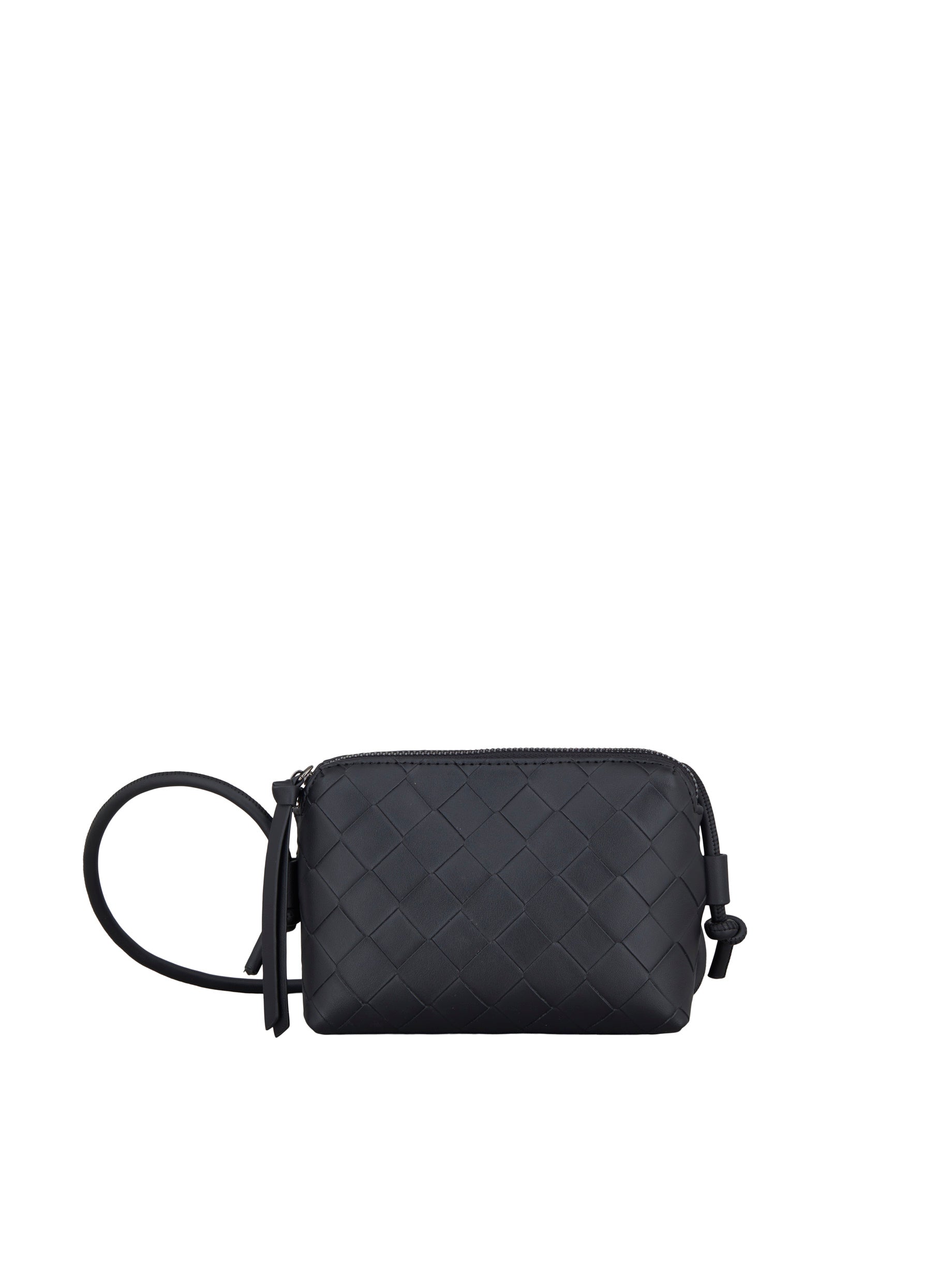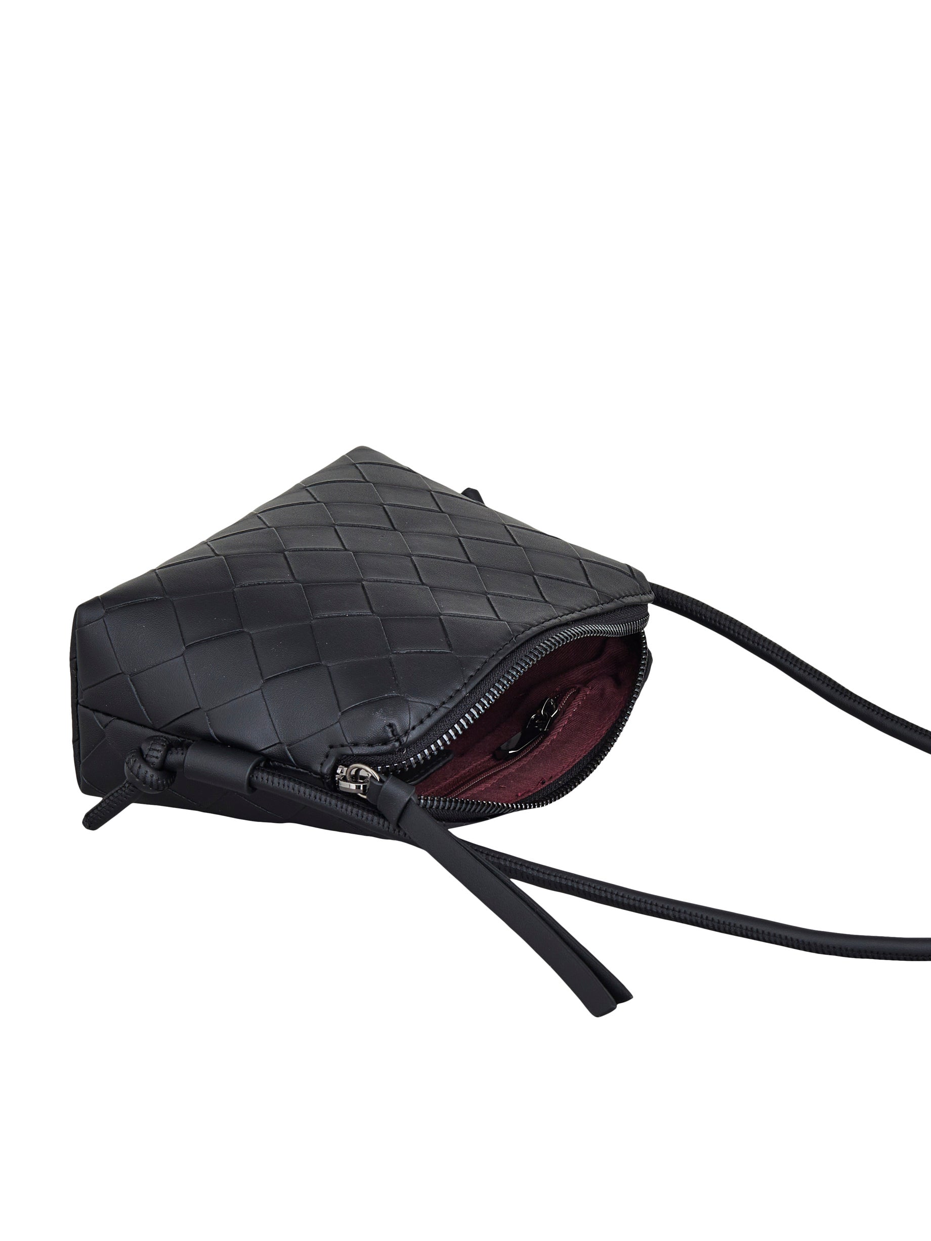 Sød skuldertaske med flettet mønster i sort med en lang rem samt lynlåslukning. Tasken rummer det mest nødvendige, og har et åbent rum med en lille lynlås lomme indvendig.