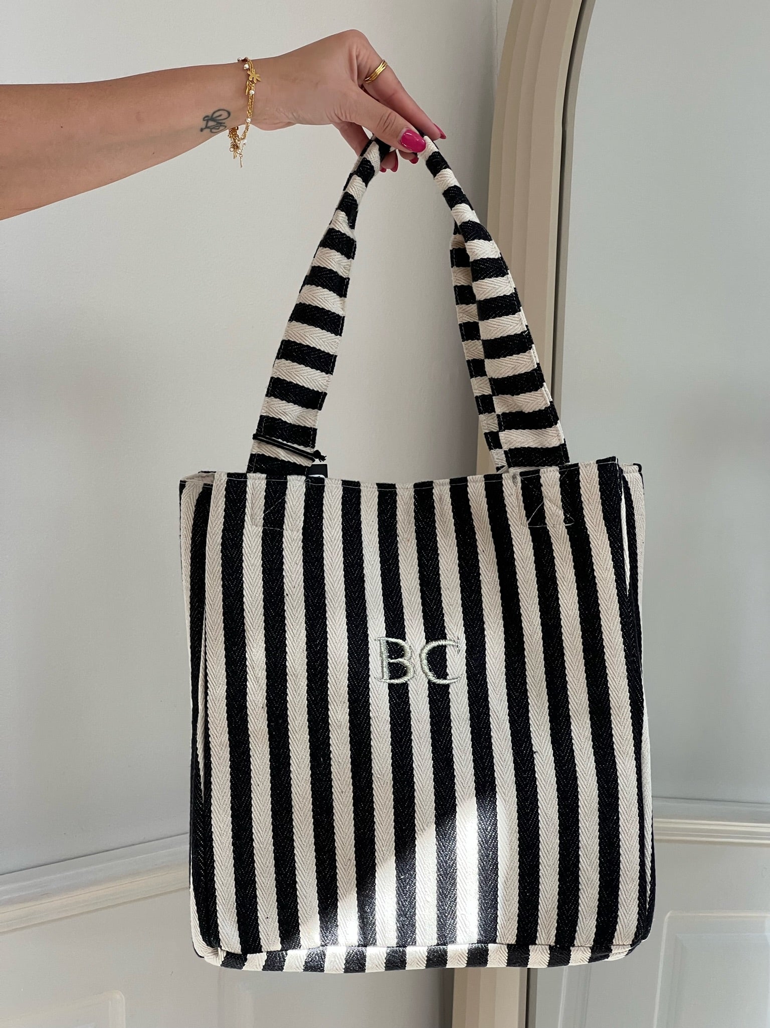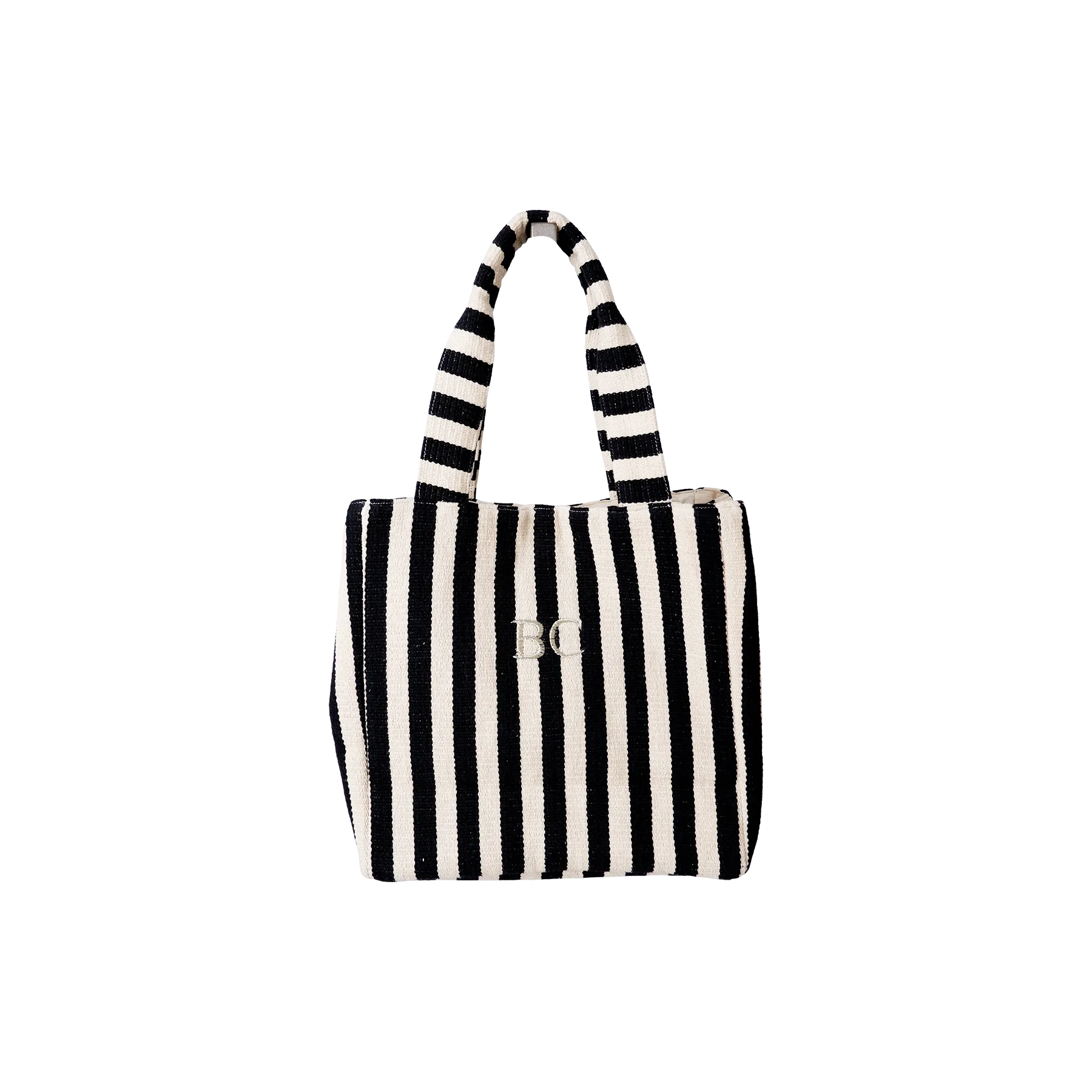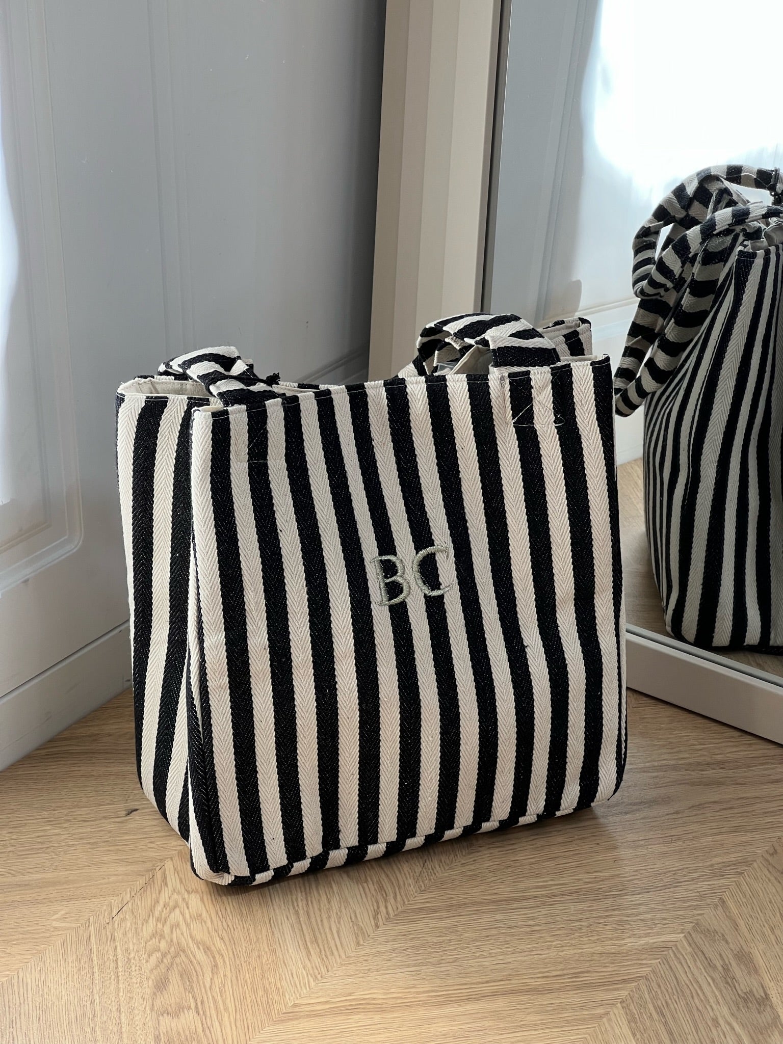 Super flot taske fra Black Colour, som er perfekt til hverdagens nødvendigheder! Tasken er lavet i 100% bomuld i en kraftig og robust kvalitet. Den lukkes med en magnetknap og kan holdes sammen indvendigt med en strop. Udvendigt har tasken striber i beige og sort, der fortil prydes af et broderet "BC" logo. Indeni er den beige. Tasken kan bæres over skuldrene eller i hånden med en hank.