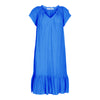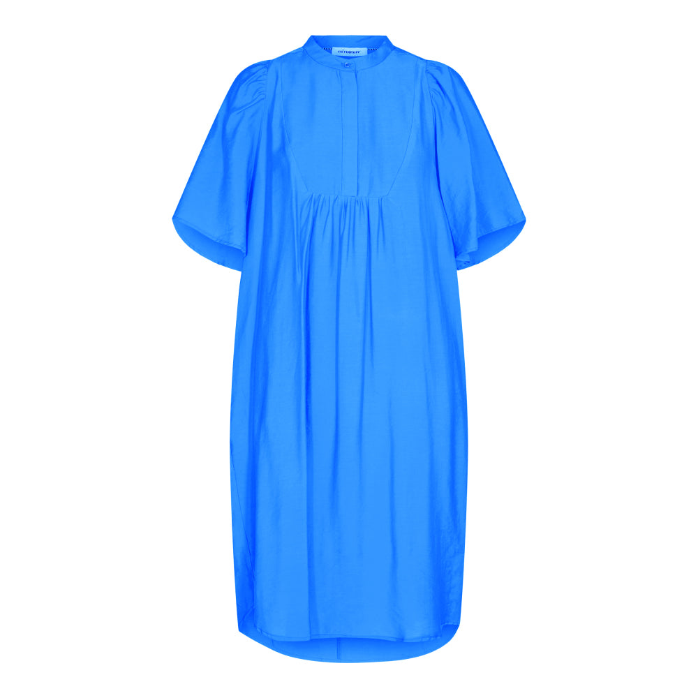 Superskøn kjole fra Co'Couture i en smuk, blå farve. Kjolen har løs pasform med en god volumen. De korte, løse ærmer har en fin rynkedetalje ved skuldrene, som giver en flot effekt. Fortil har kjolen skjulte knapper og under brystet findes der ligeledes en rynkeeffekt.