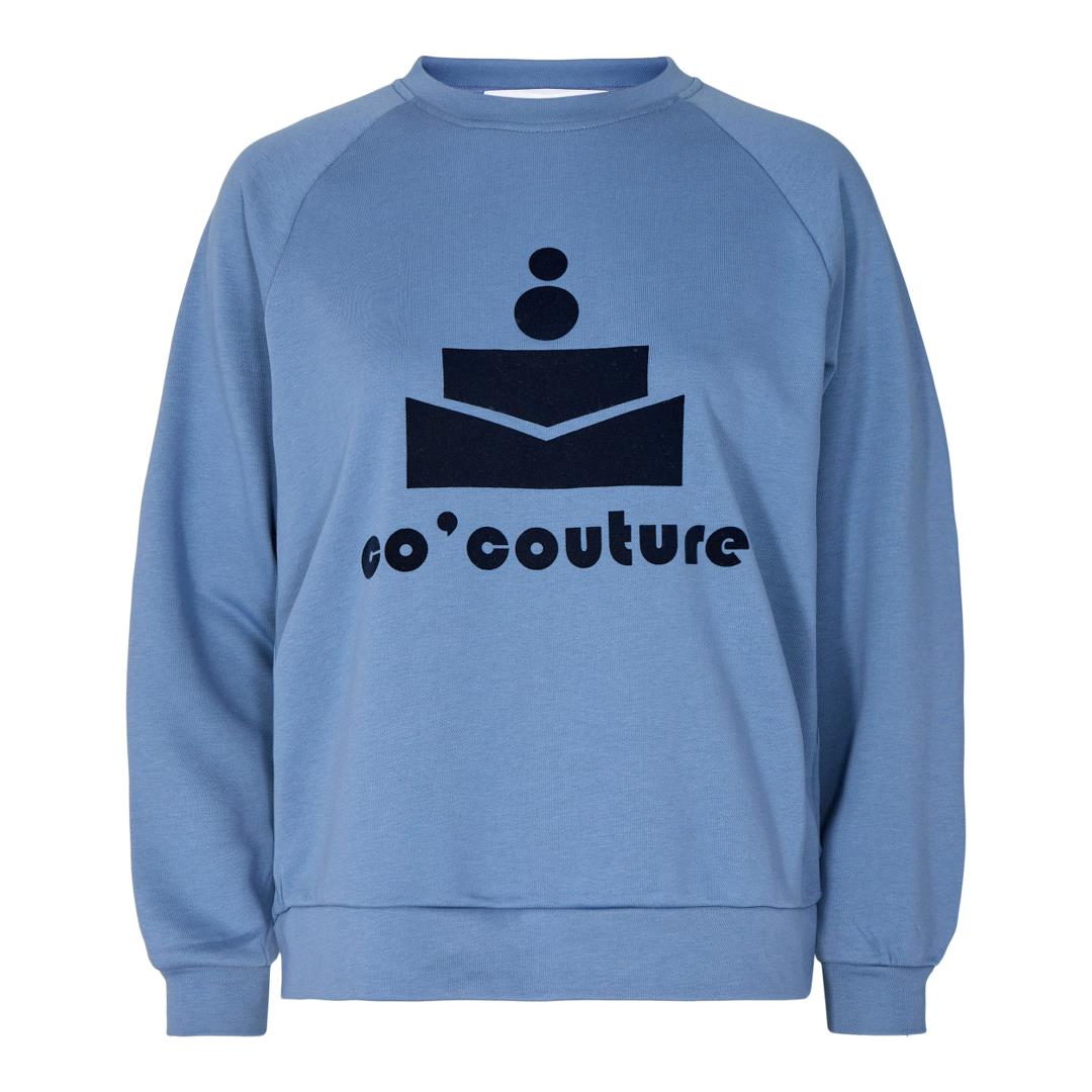 Skøn sweatshirt fra Co'Couture i et helt klassisk snit. Logoet foran er produceret i et blødt, velourlignende materiale, der giver et lækkert udtryk. Sweatshirten har rund hals og lange ærmer. Den blå farve er super skøn at style til et par jeans.
