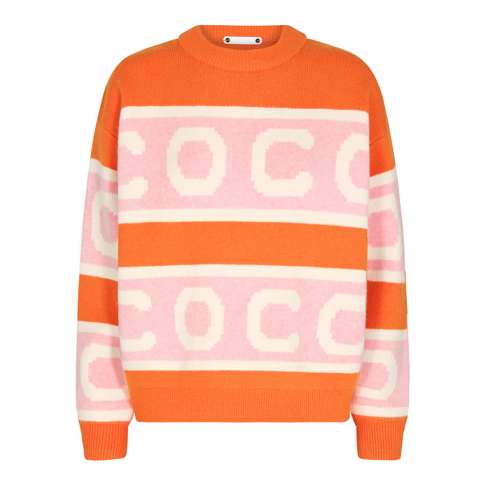 Lækker strik fra Co'Couture i en smør-blød kvalitet, som ikke kradser. Strikken er en bred model med rund halsudskæring og lange ærmer. Farvekombinationen består af orange, lyserød og creme, hvilket giver et cool og legende udtryk.