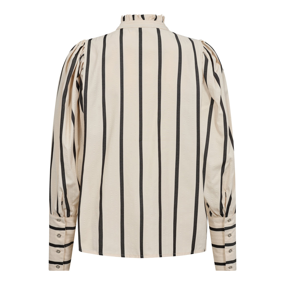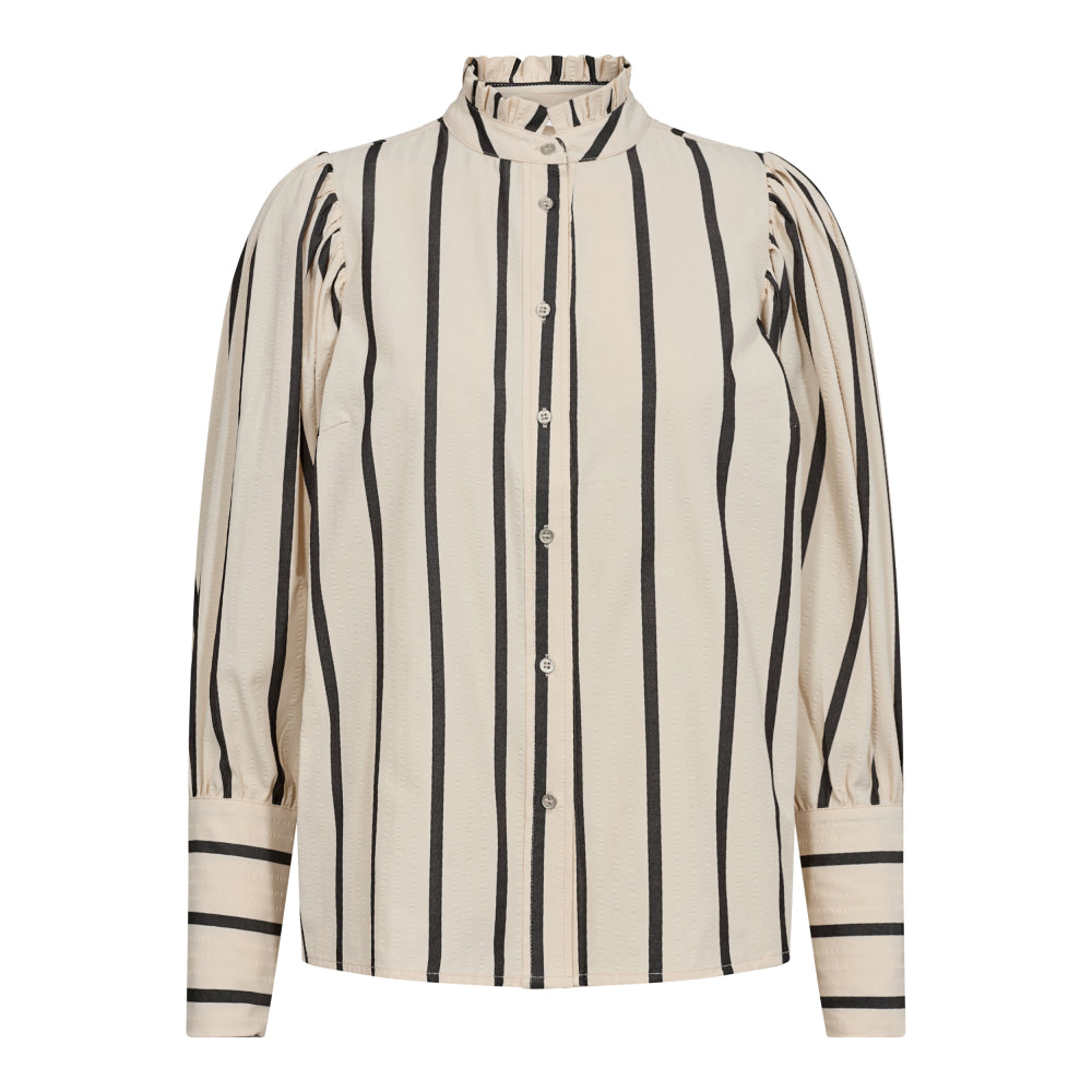 Virkelig smuk skjortebluse fra Co'Couture med fine detaljer. Skjorten har høj hals med flæser, ange ballonærmer og gennemknapning. Desuden har den kontrastfulde striber.