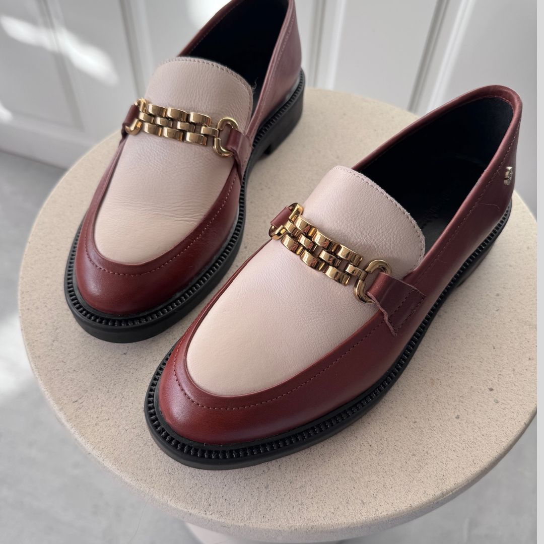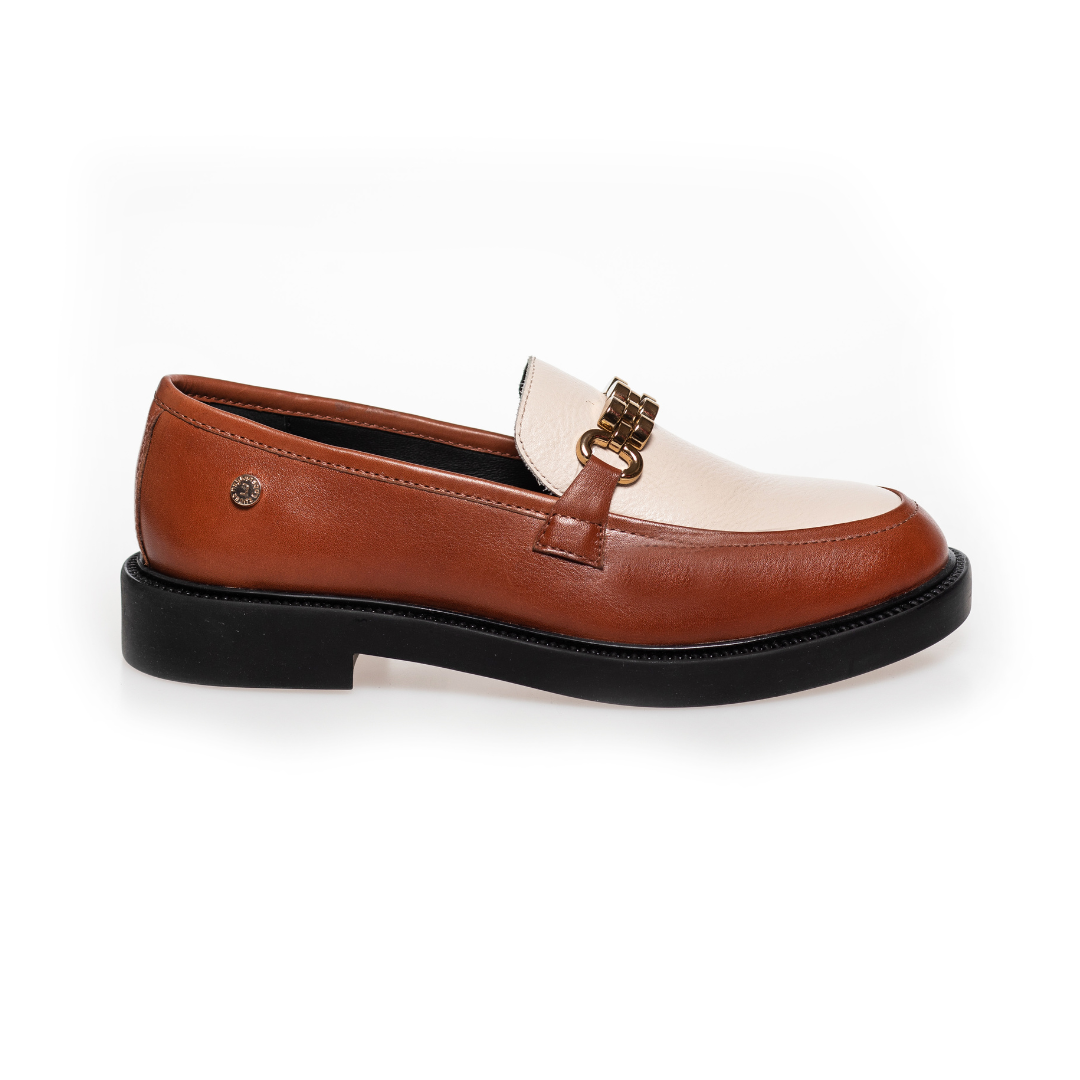 Super fine loafers i en farvekombination af en cognacfarve og beige. Skoen har et gyldent spænde henover foden som prikken over i'et. Style dem både til hverdag og til fest.