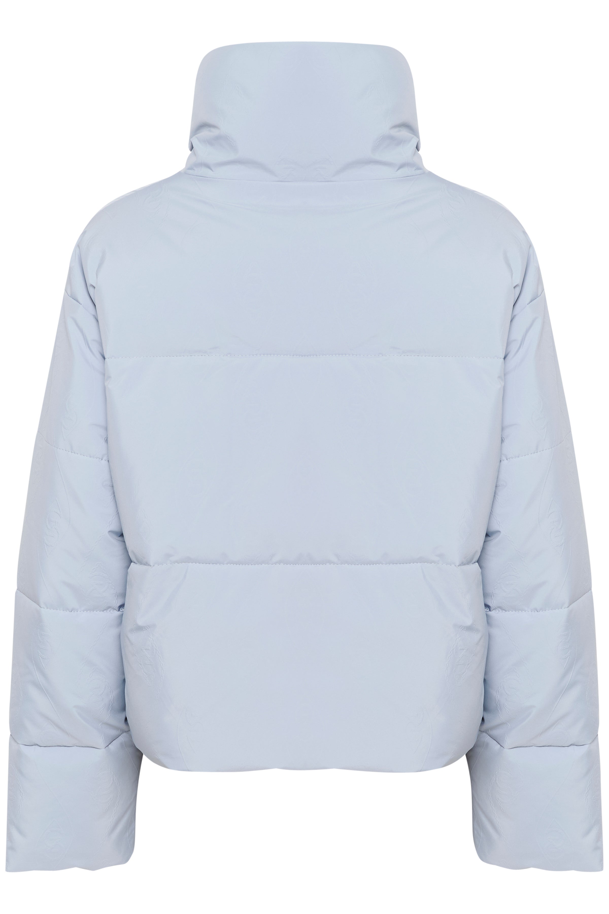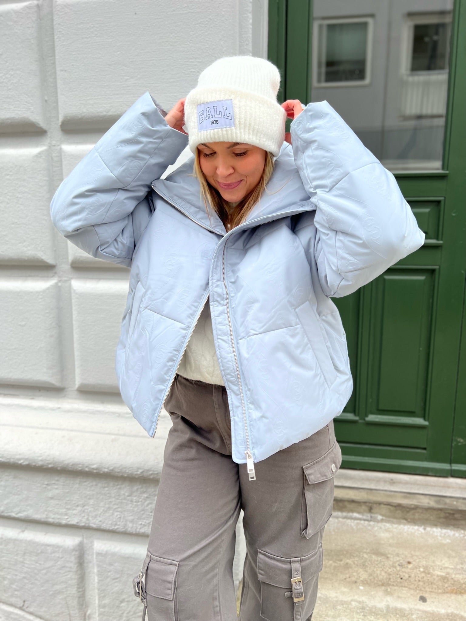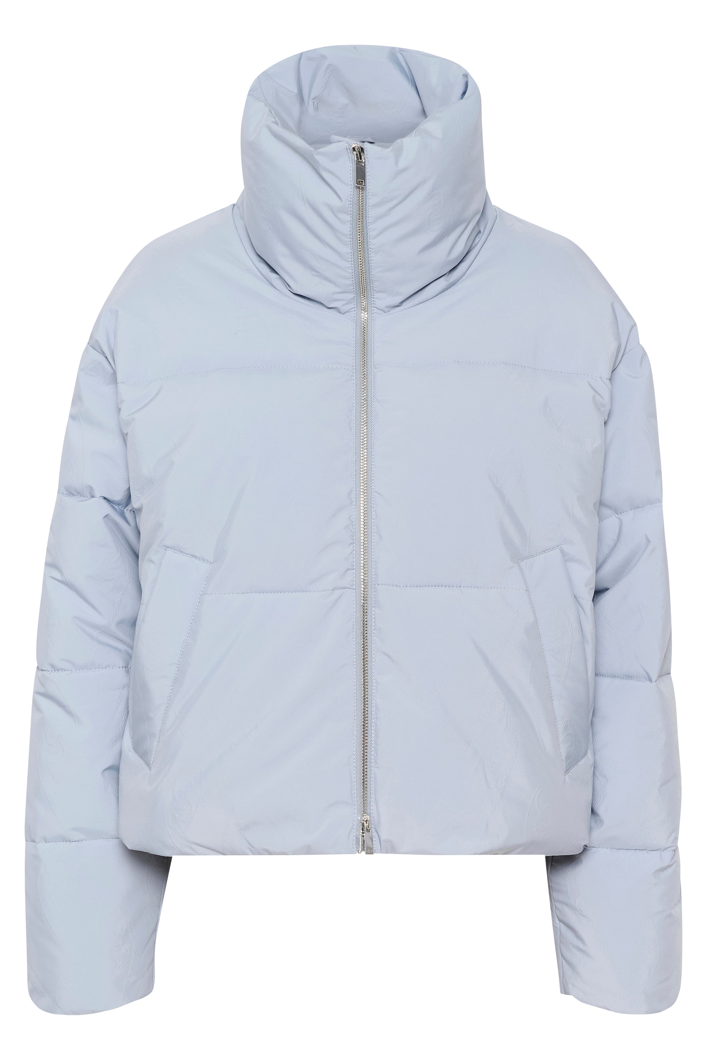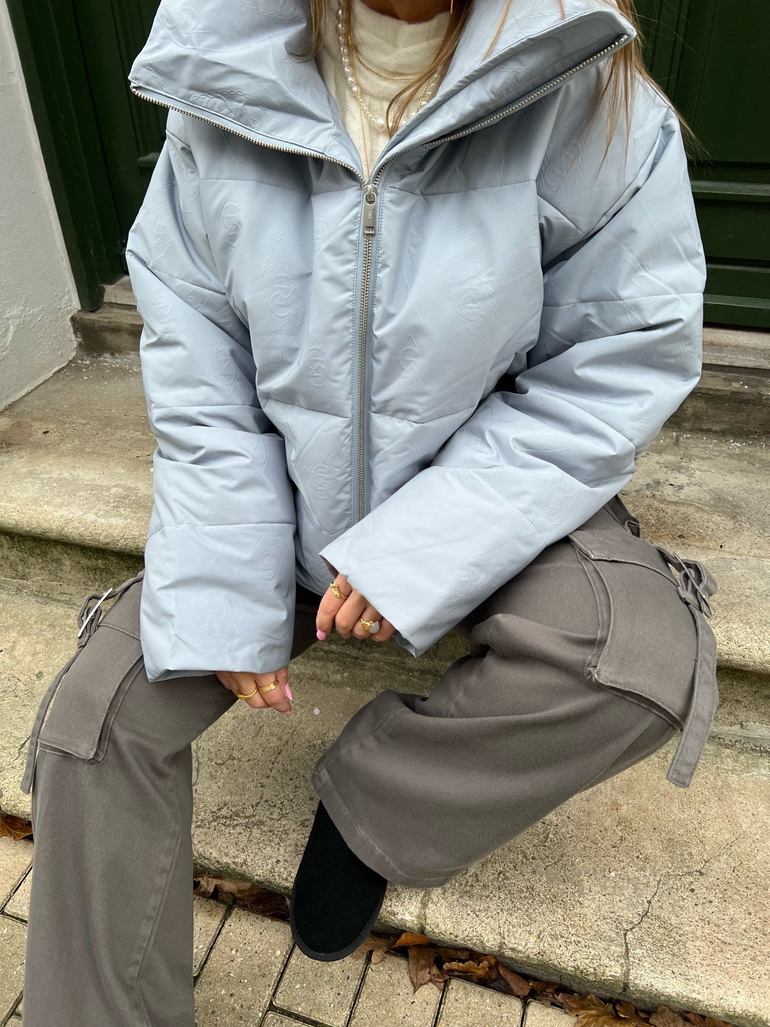 Cool kort dun jakke i en flot blå-grå farve. Jakken er med en høj hals, og lukkes med lynlås. På jakken er der et tone-i-tone GZ mønster.