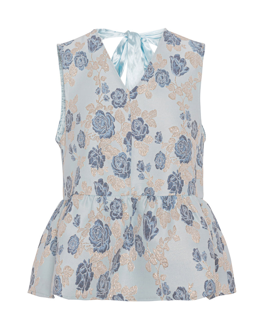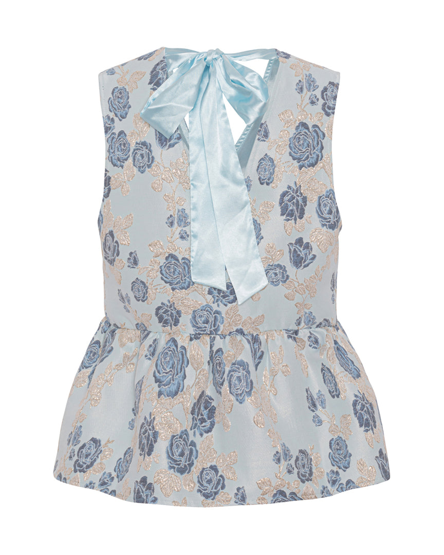 Denne smukke top fra Hunkøn har v-hals og peplum-effekt i bunden. I nakken er der påsat en silkesnor, der kan bindes som en sløjfe som en skøn detalje. Stoffet er lyseblot med et broderet blomstermønster i blå og gyldne nuancer. Utrolig smuk til enhver festlig anledning.