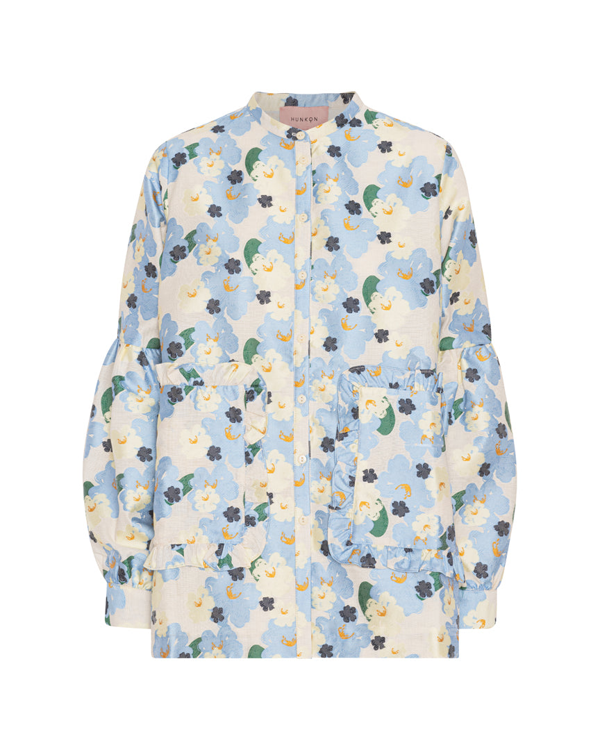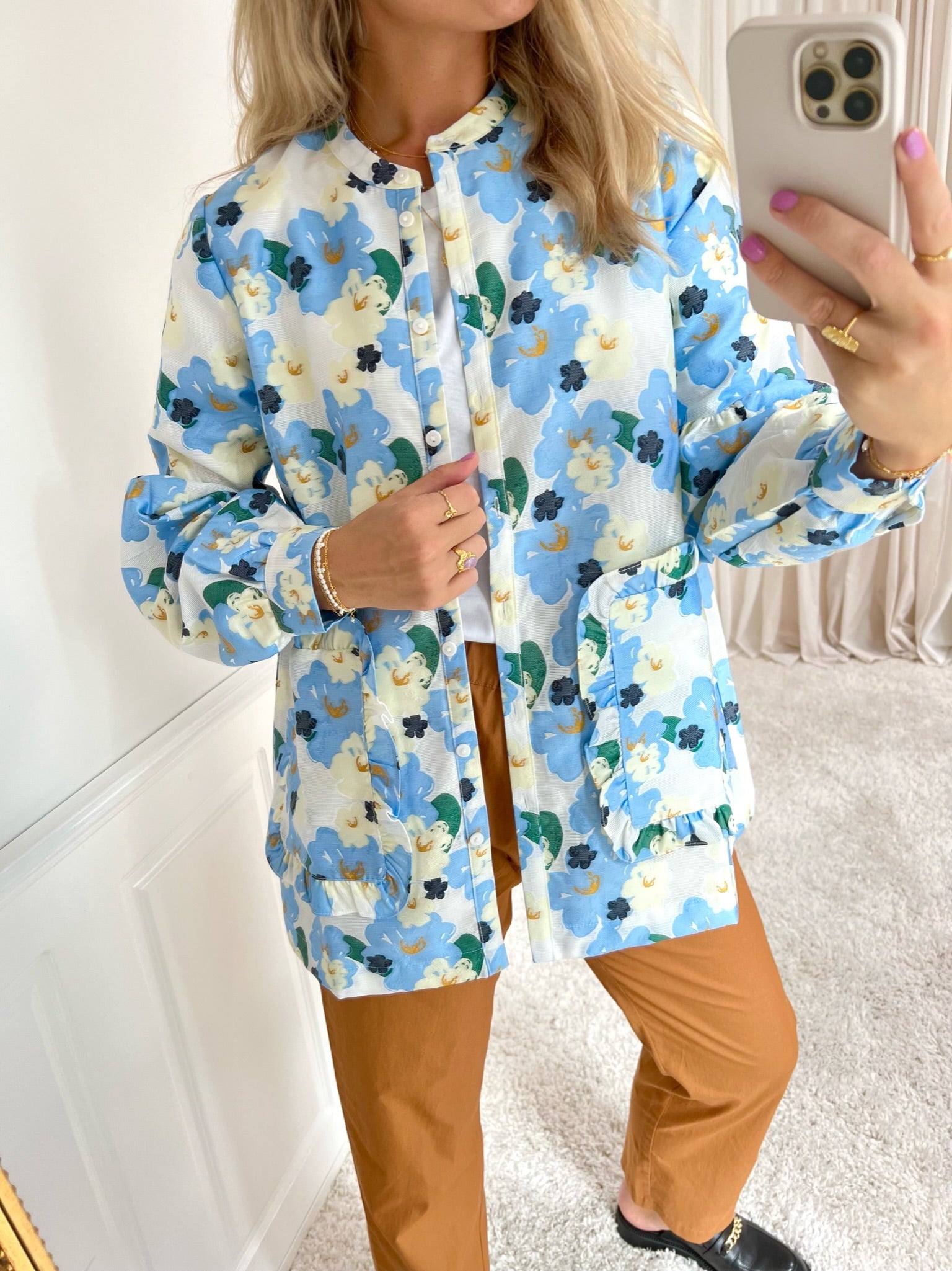 Super fed jakke i et blomstret mønster med fede detaljer. Jakken har knaplukning hele vejen ned, samt smukke flæsedetaljer foran og kinakrave. Den er helt perfekt som overgangsjakke.