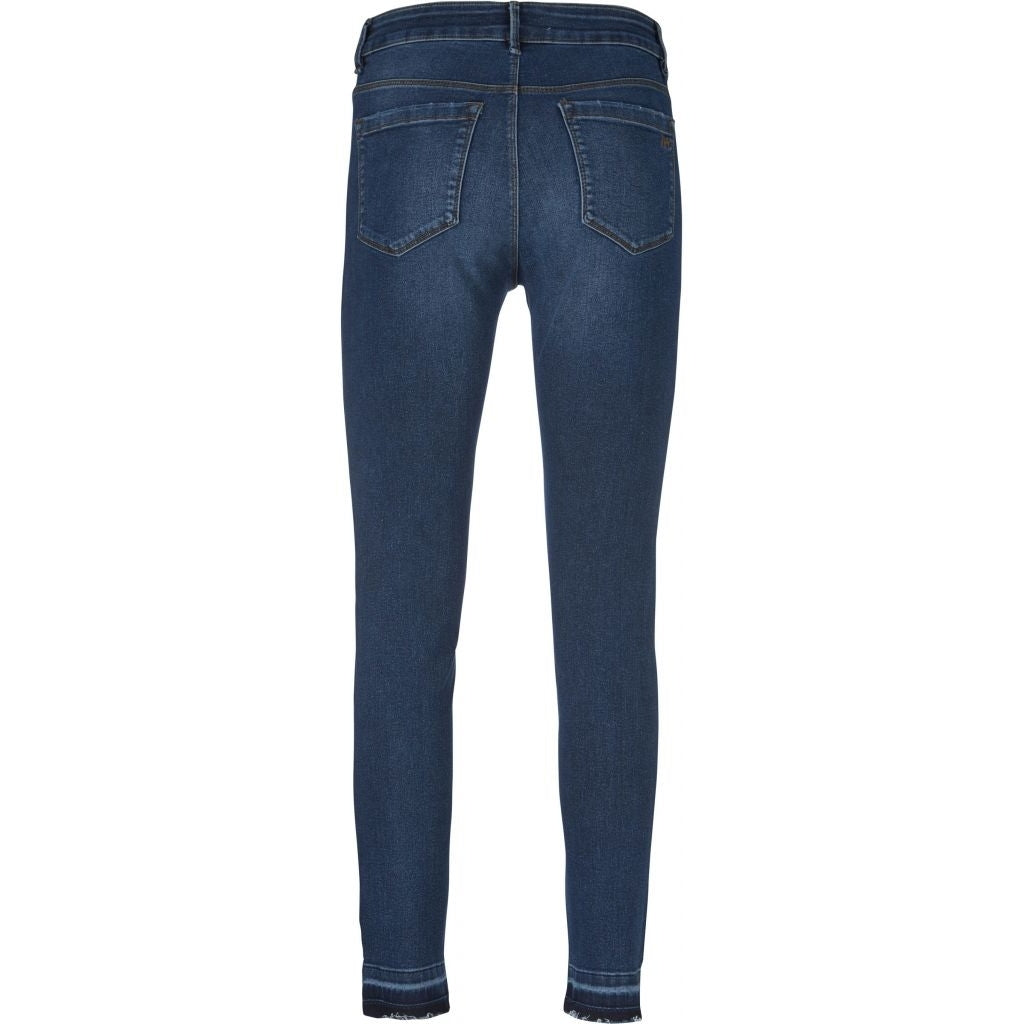 Lækre højtaljede bukser i en flot denim farve med både lommer foran og bagpå. Buksen har en fed trævle detalje i bunden af begge bukseben samt et stof med massere af stræk.