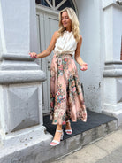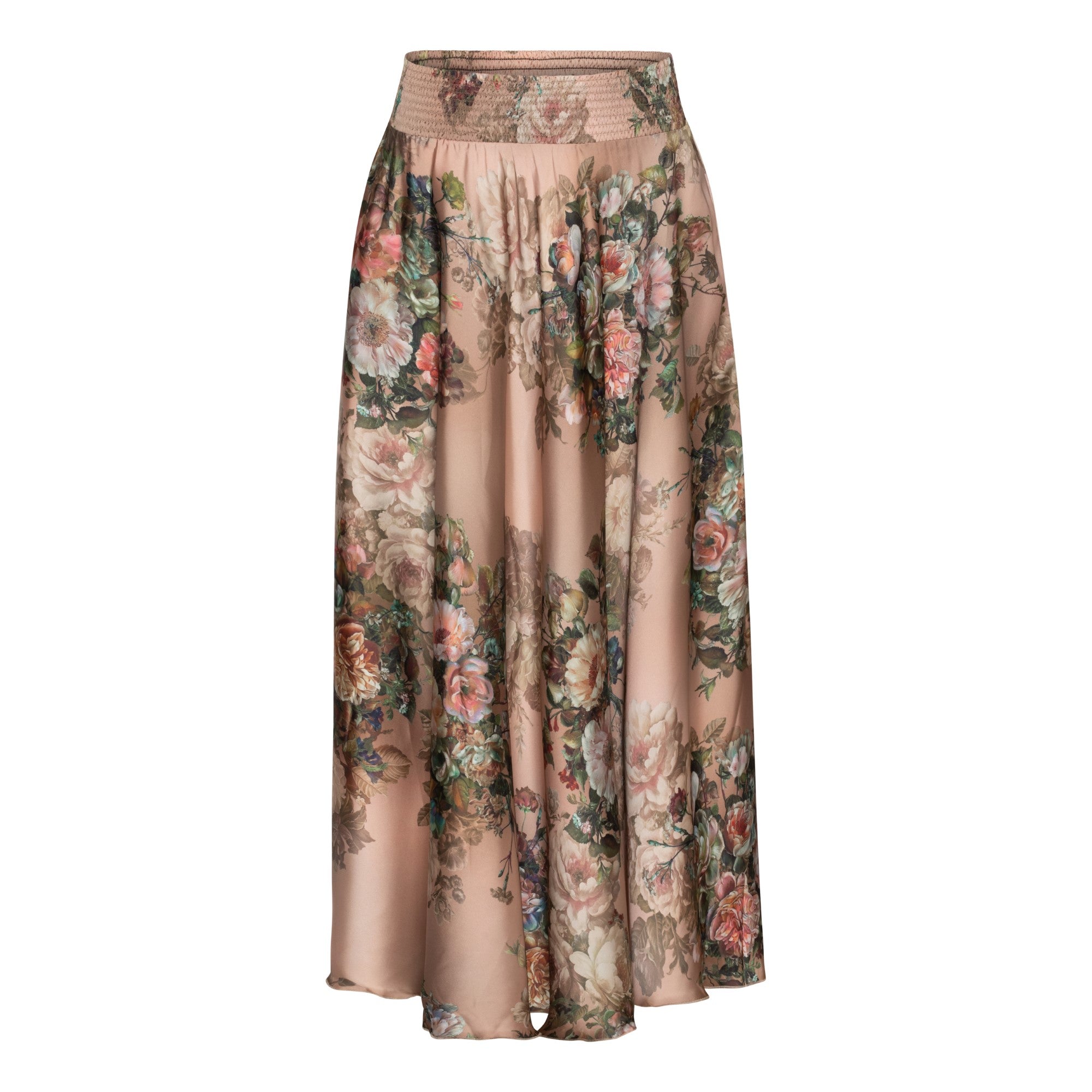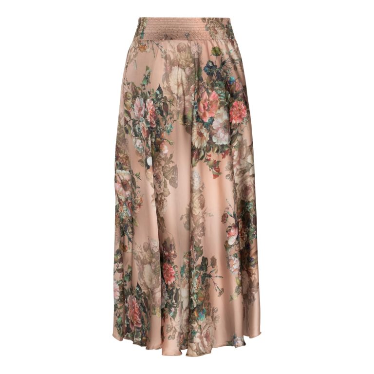 Den smukke Savannah nederdel fås også i dette blomstrede print. Nederdelen er syet i en eksklusiv satinkvalitet, der falder lækkert omkring benene. Den er en lang model med et bredt elastikbånd i livet.