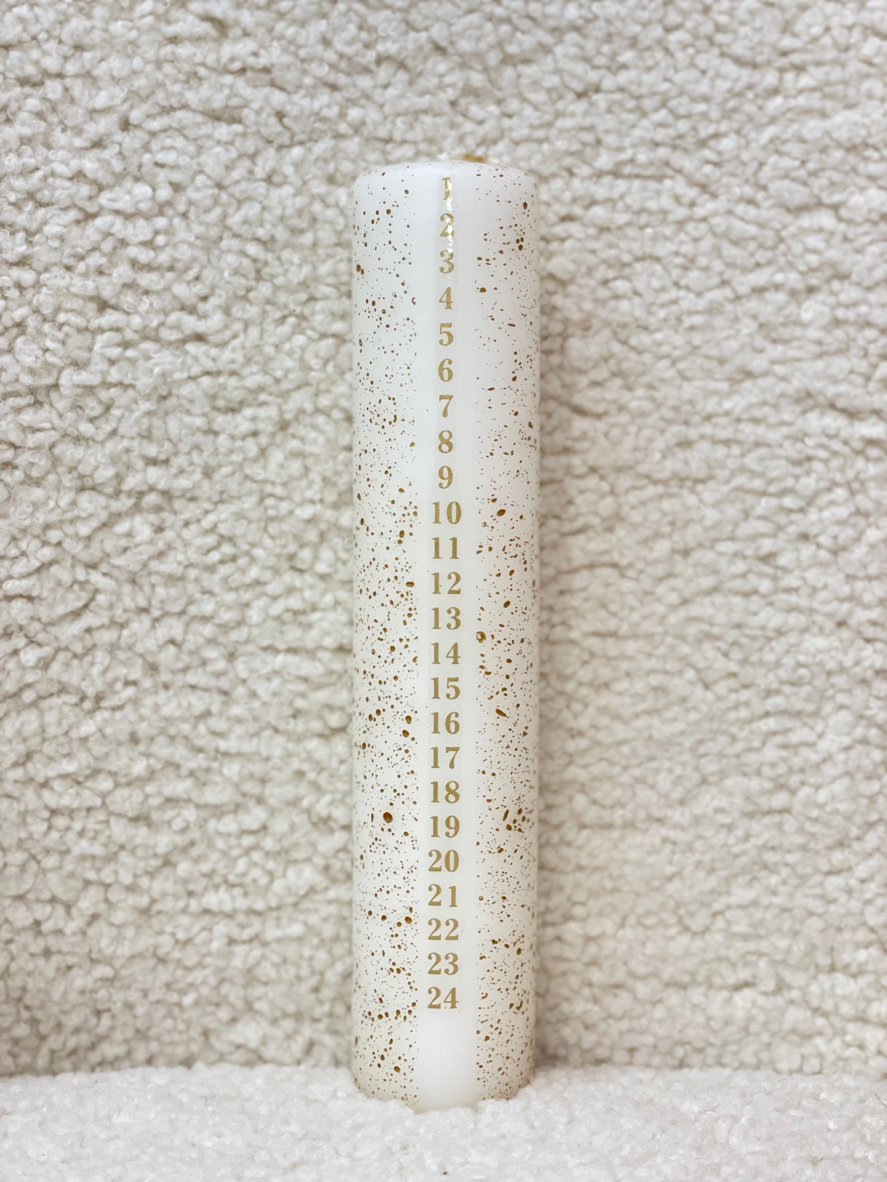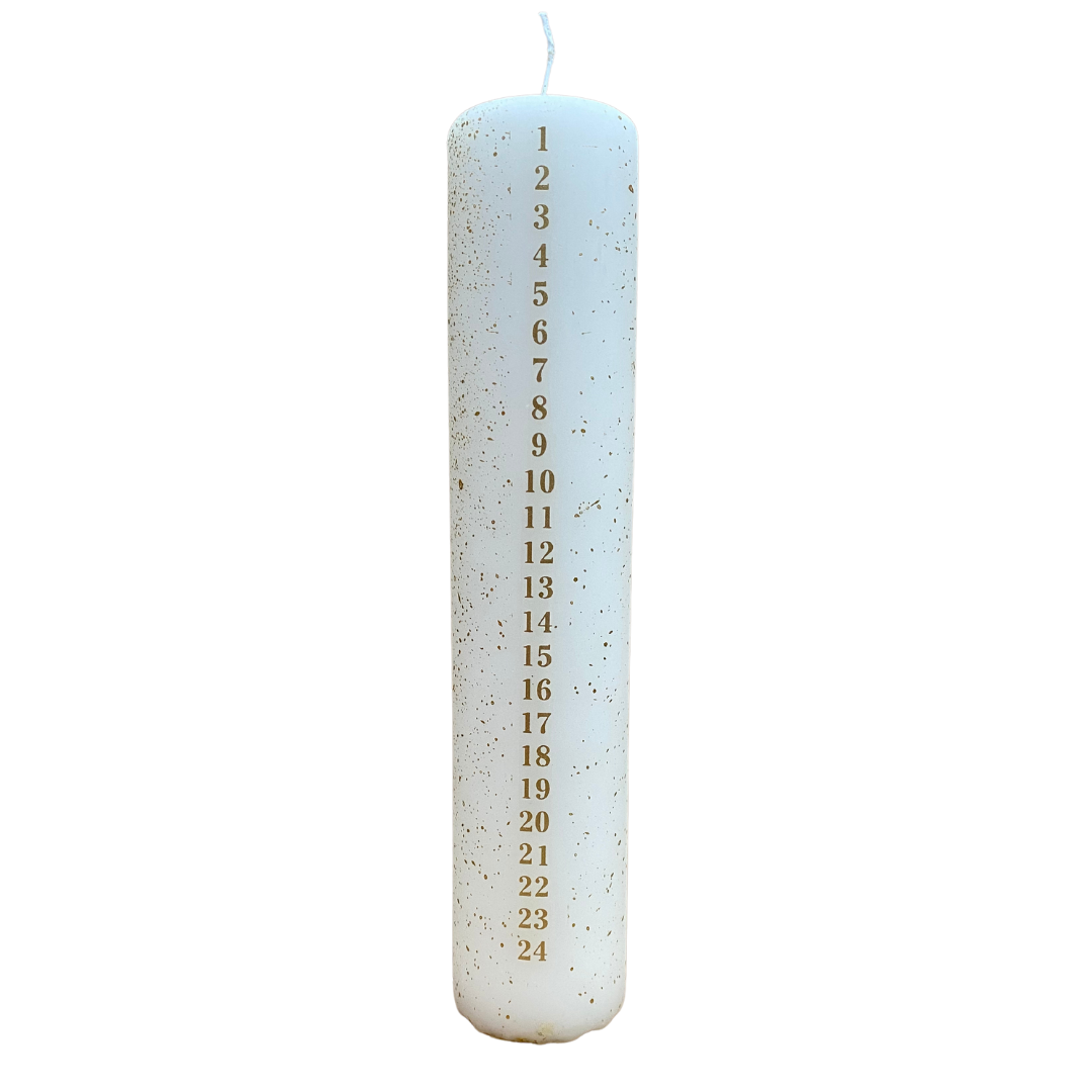 Skab en hyggelig og traditionsrig julestemning med dette smukke kalenderlys. Lyset er produceret i en blanding af ren paraffin og ren stearin, og er dekoreret med det fineste guldfarvet splash samt guldfarvet kalendertal.