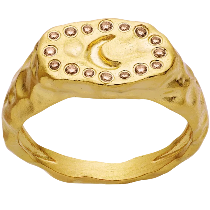 Smuk fyldig ring med banket overflade. Den er prydet med en måne centralt foran, som er omringet af små, champagnefarvede zirkoner.
