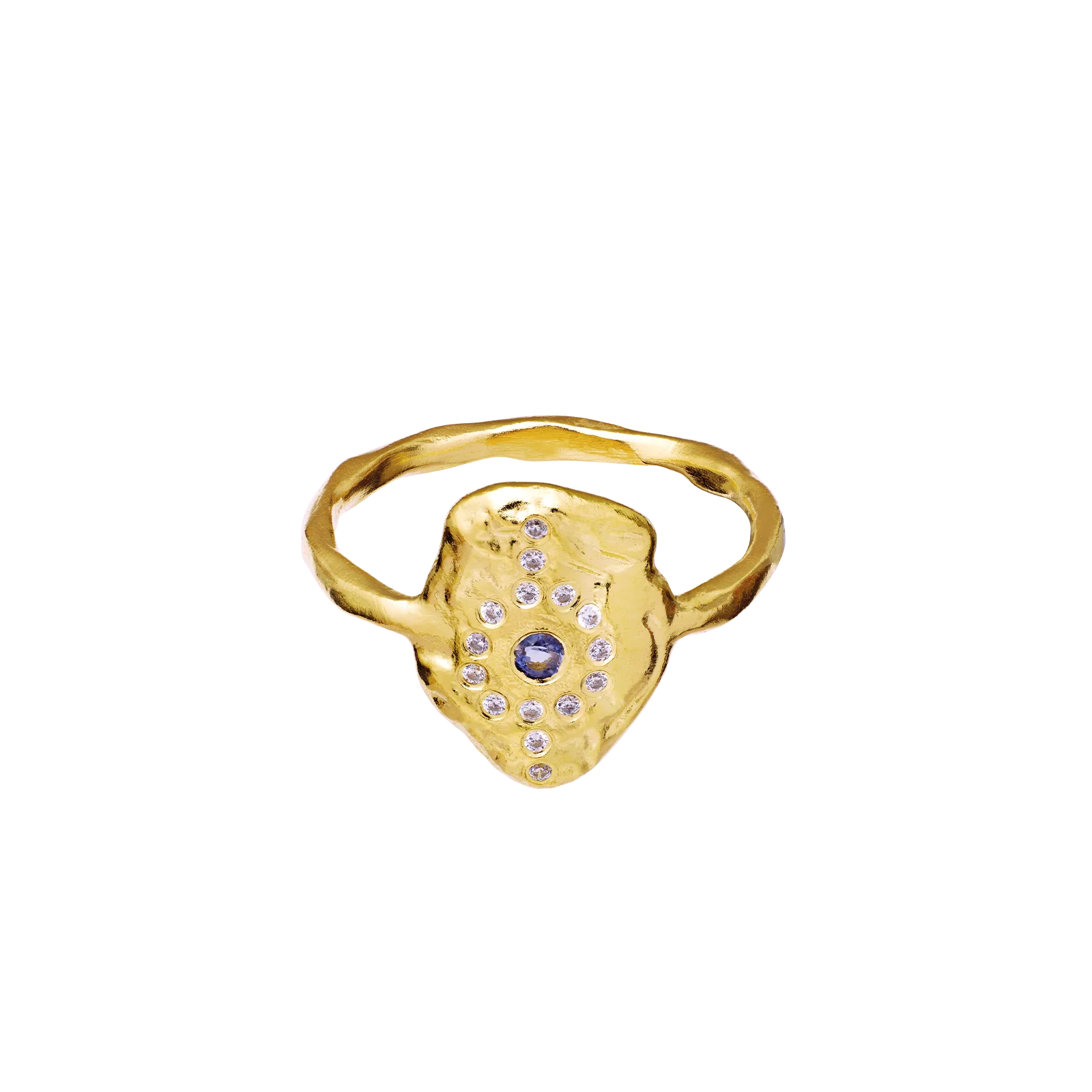 Smuk ring med en fin, banket front, der er pyntet med små sten - både mørke og lyse. Brug den alene eller sammensat med andre fingerringe.