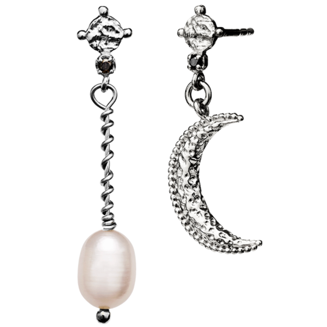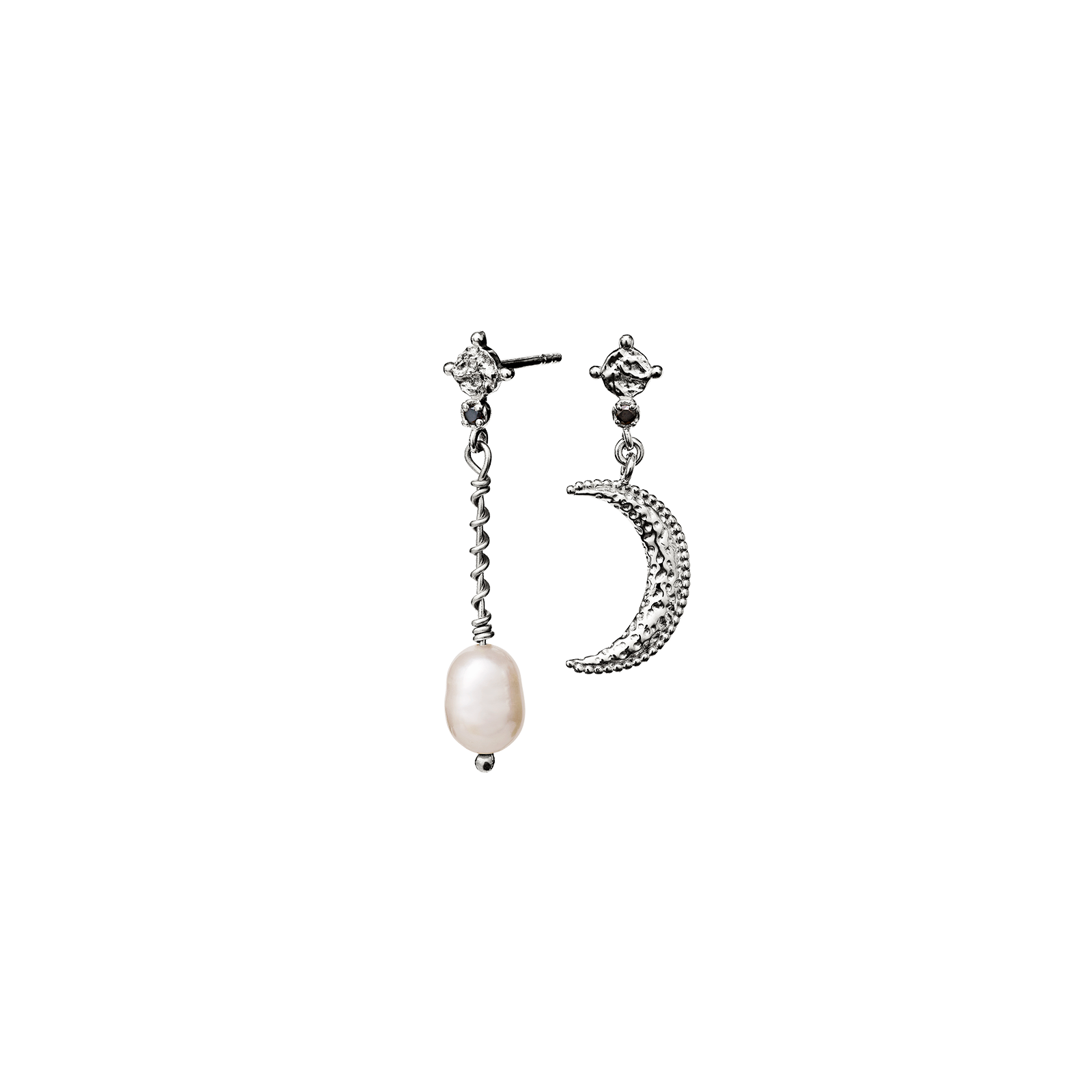 Denne fine style fra Maanesten består af to forskellige øreringe. De består begge af en hammerslået ørestik med en lille, sort diamant. Den ene ørering består derudover af snoninger og en ferskvandsperle, mens den anden består af et vedhæng formet som en måne.