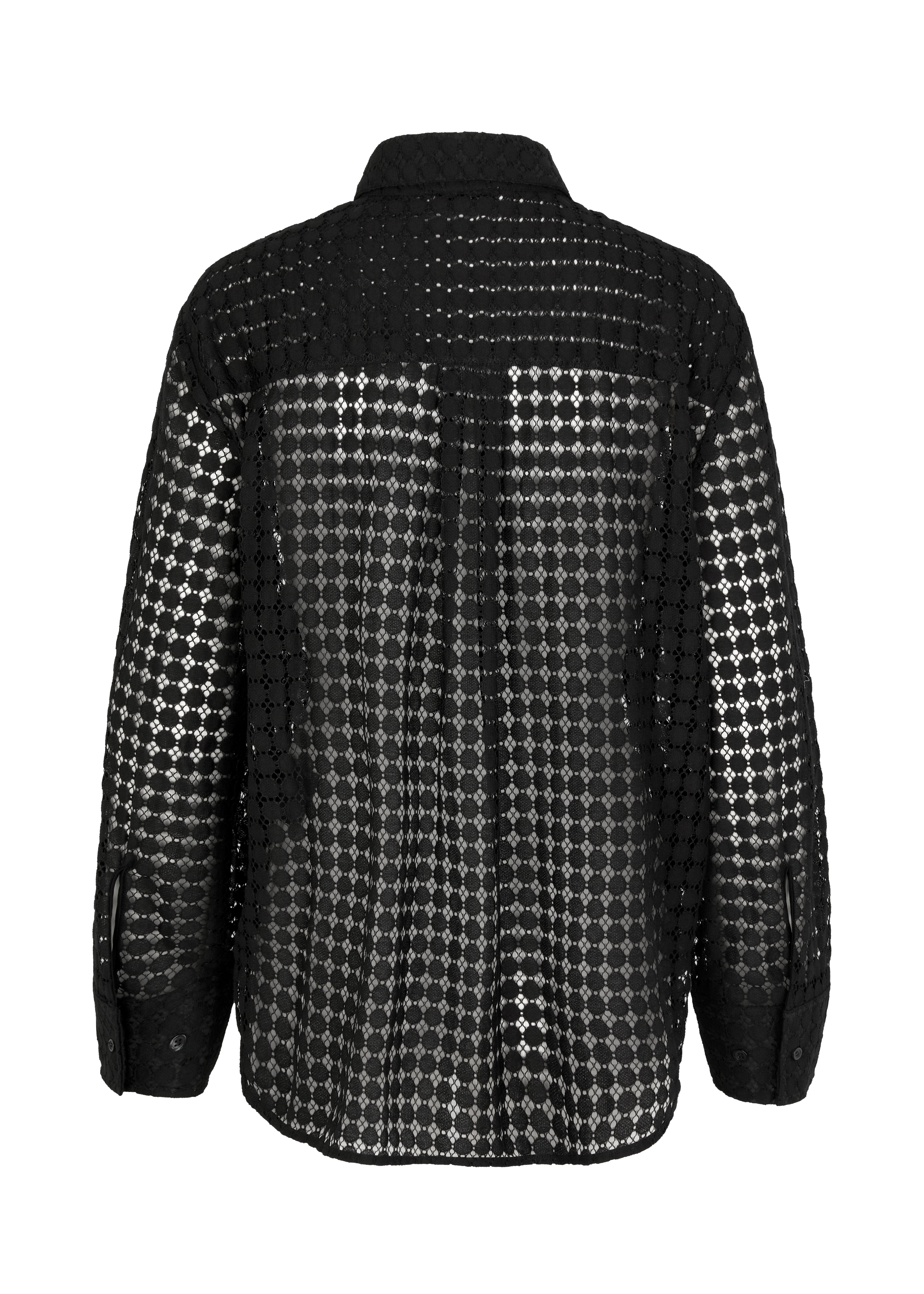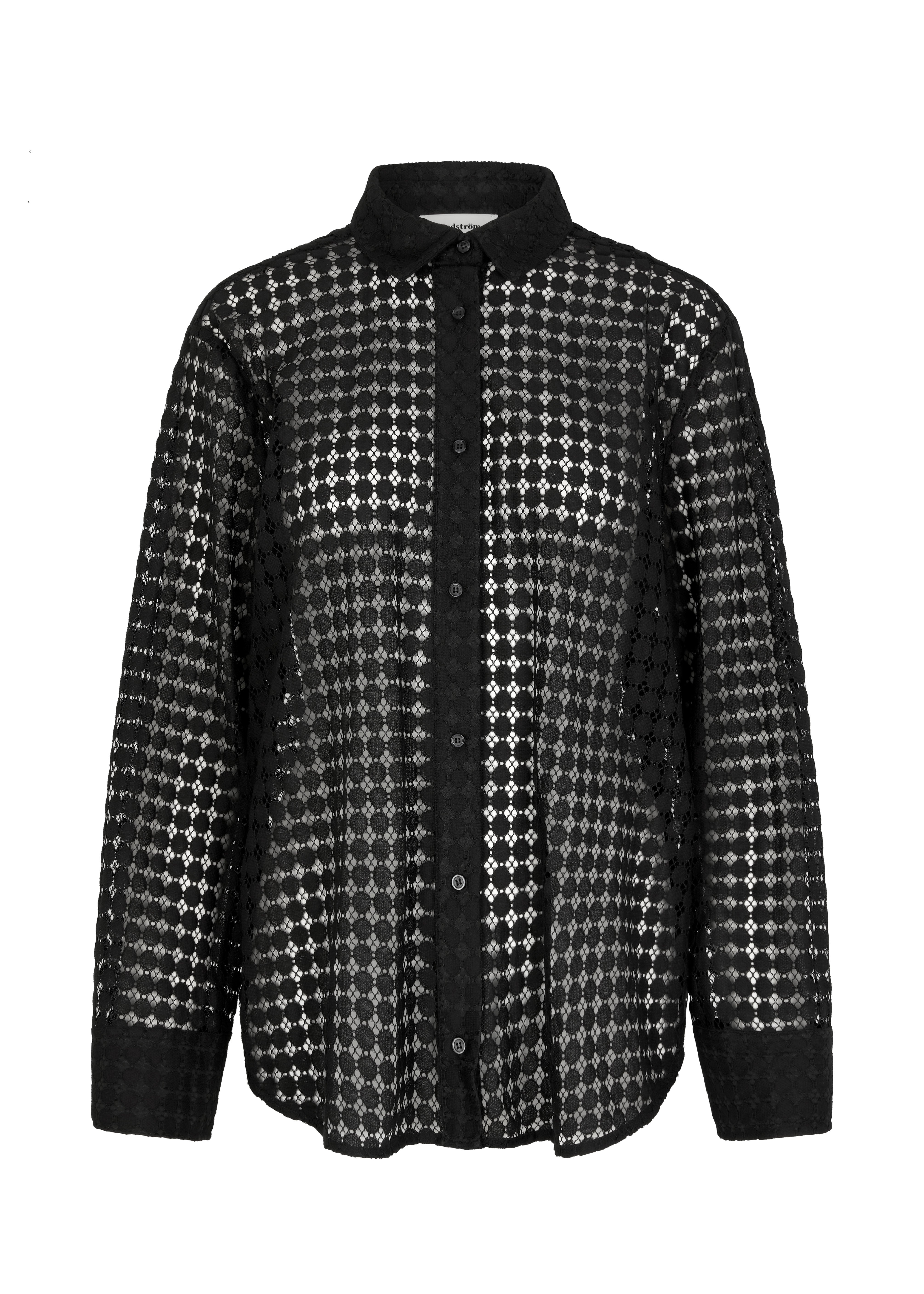Hattie skjorten har en afslappet silhuet og den er fremstillet i et transparent blondemateriale. Den har lange ærmer med manchet, krave og knaplukning fortil. Style de sammen med de matchende Hattie Bukser for et gennemført blonde-look.