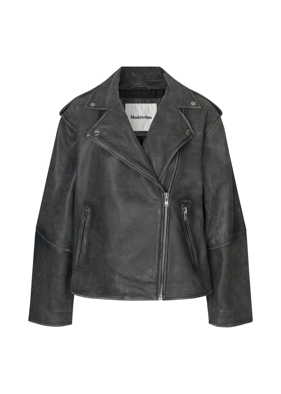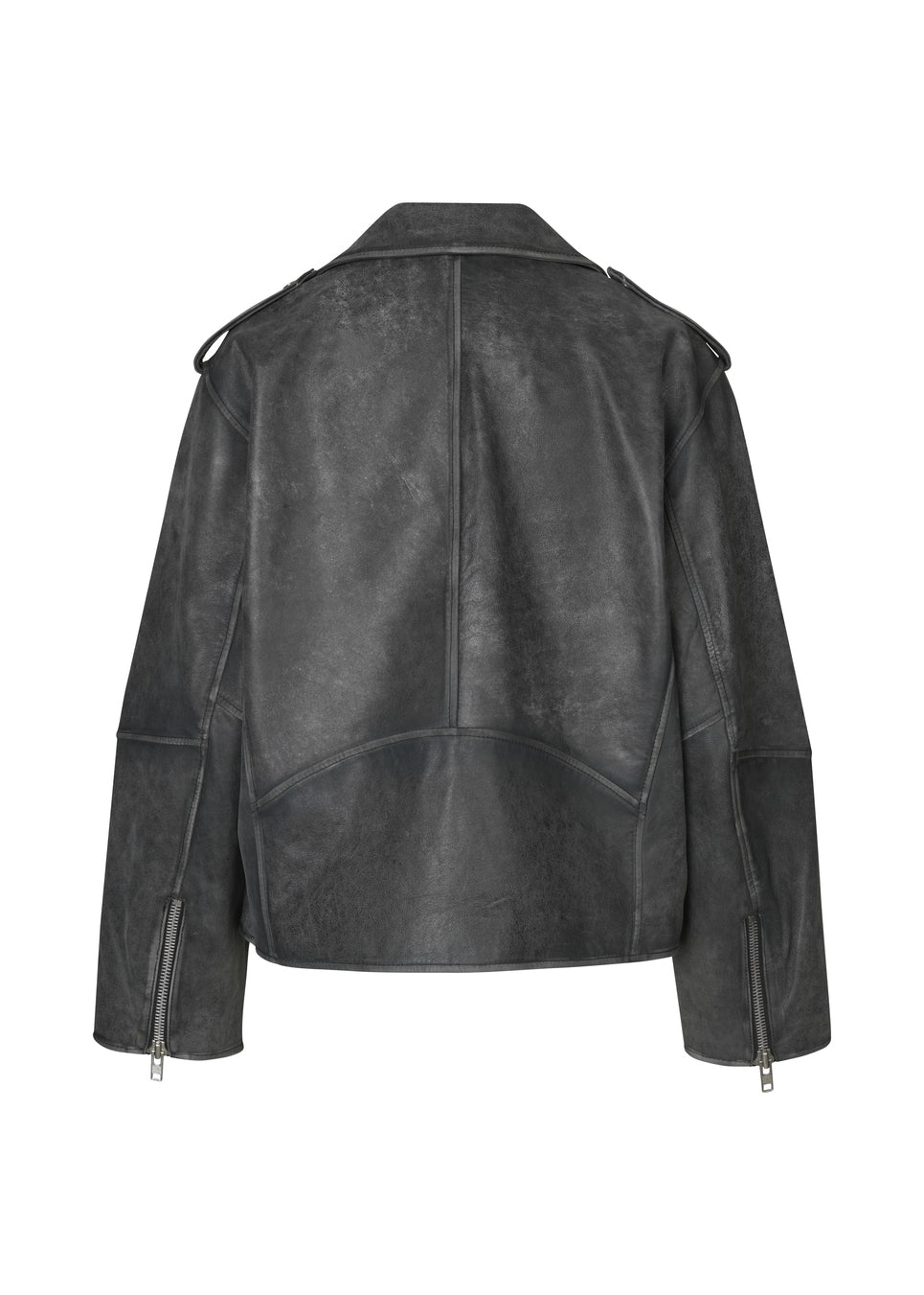 Supercool jakke i blødt lammeskind med skrå lynlås foran, revers med trykknapper samt lange ærmer med lynlås forneden. Jakken har oversized pasform og er stor i modellen.