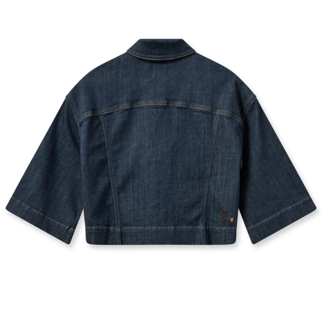 Cool jakke i helt mørk denim. Jakken er en kort model med vidde, trekvartlange ærmer. Derudover har den knapper samt markante lommer fortil. Sej at style med en T-shirt indenunder og et par lyse, pæne bukser.