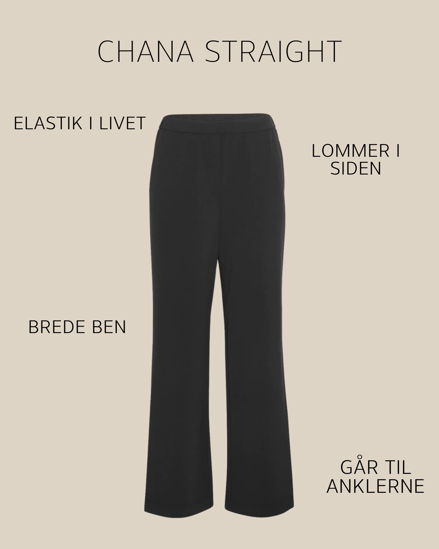 Super fine Bukser med brede ben. Bukserne har elastik i livet og lommer i siden. Chana Straight Bukser er et par klassiske bukser, som er et musthave i enhver garderobe.