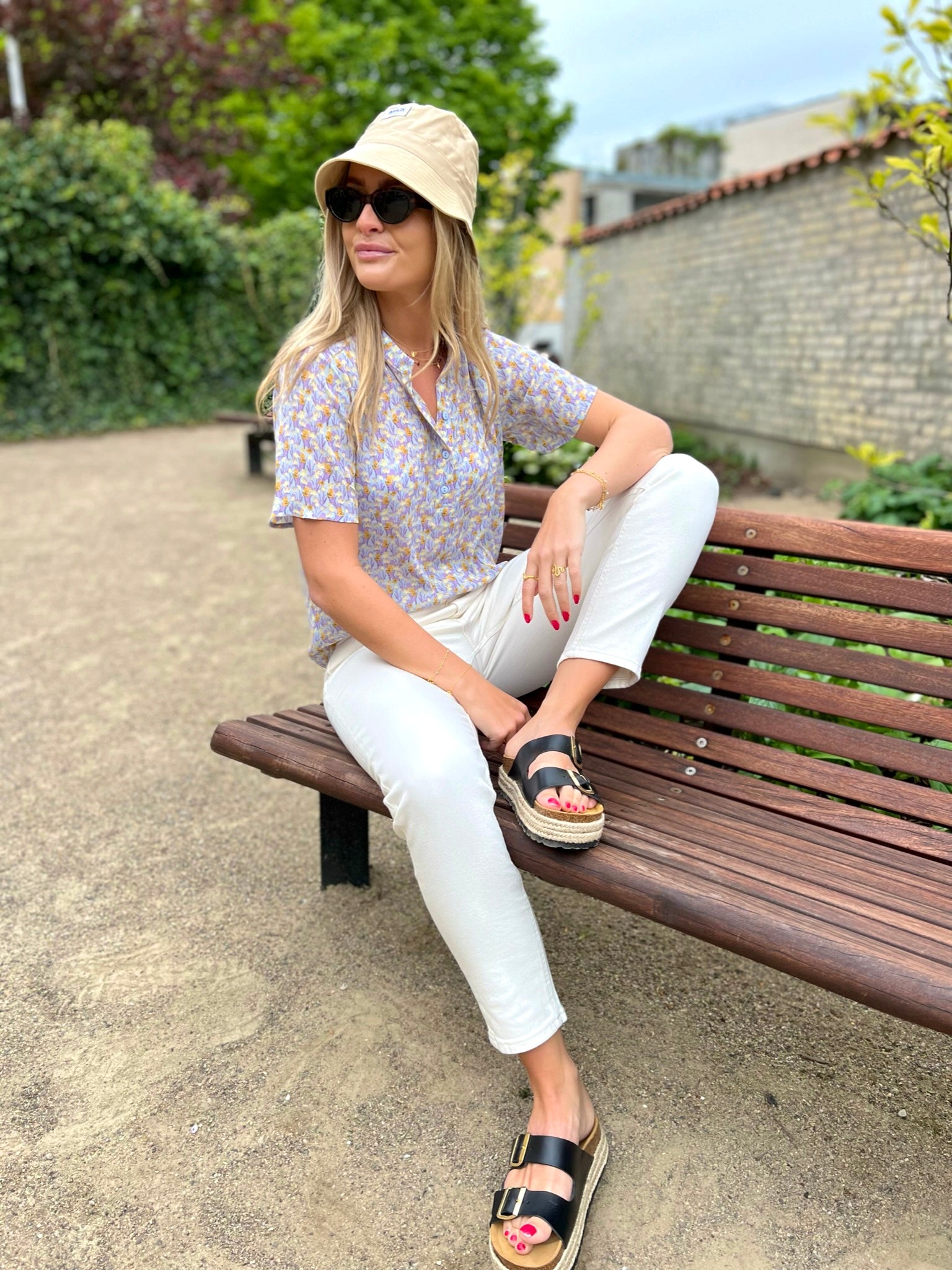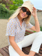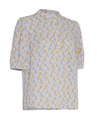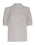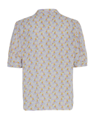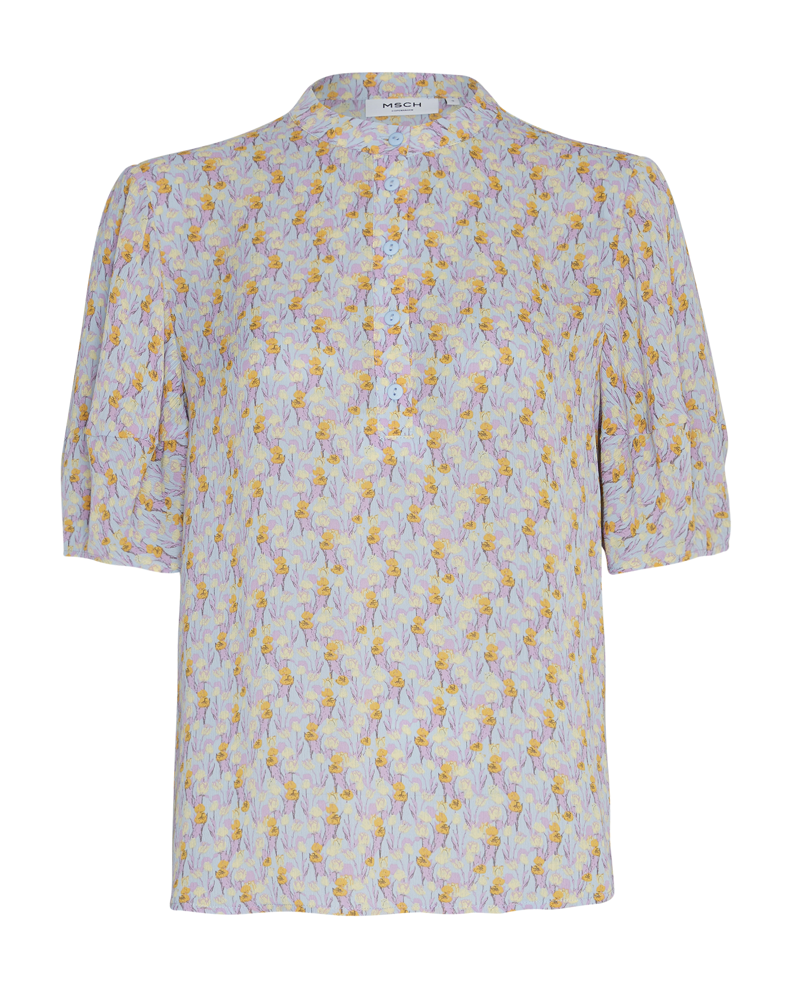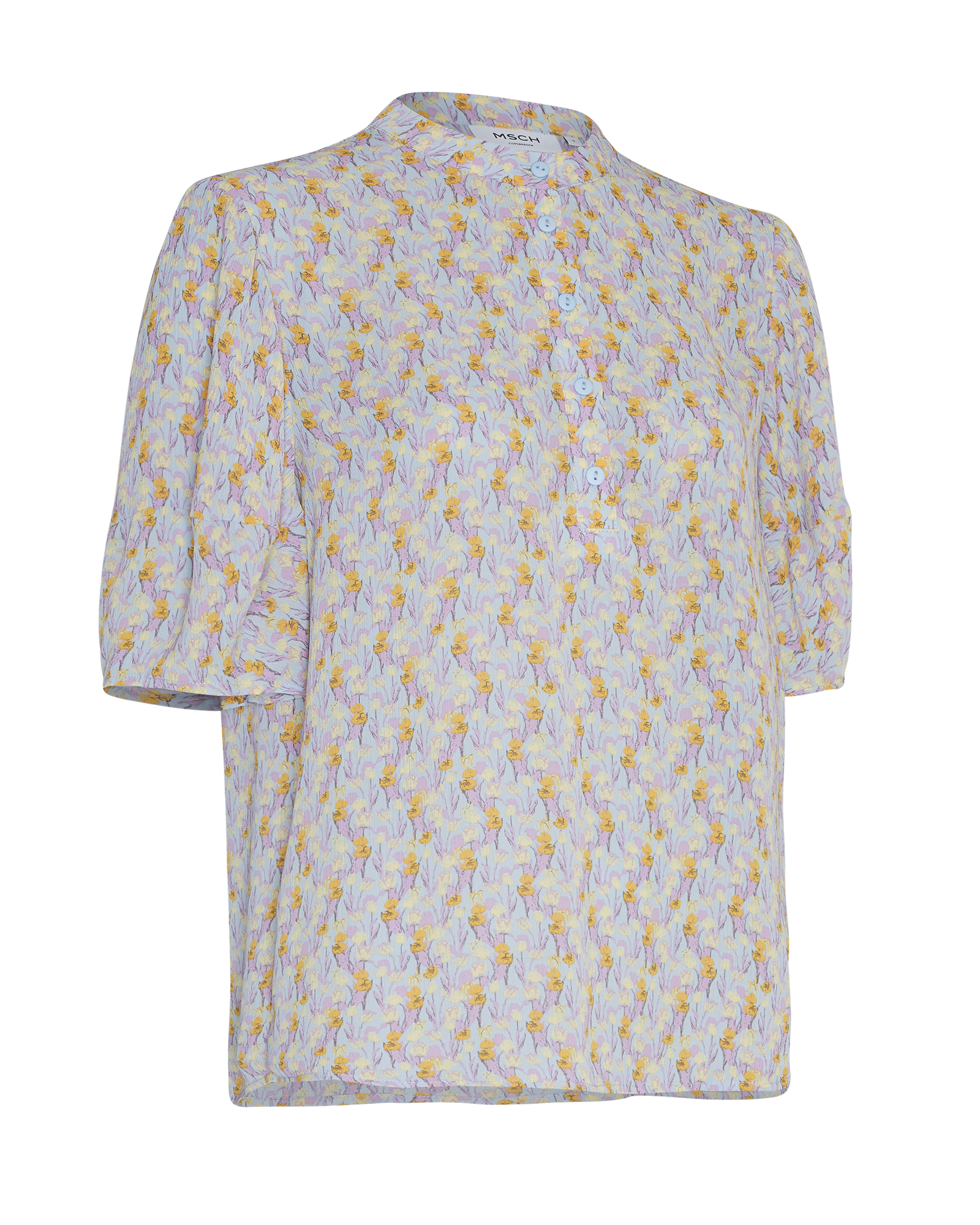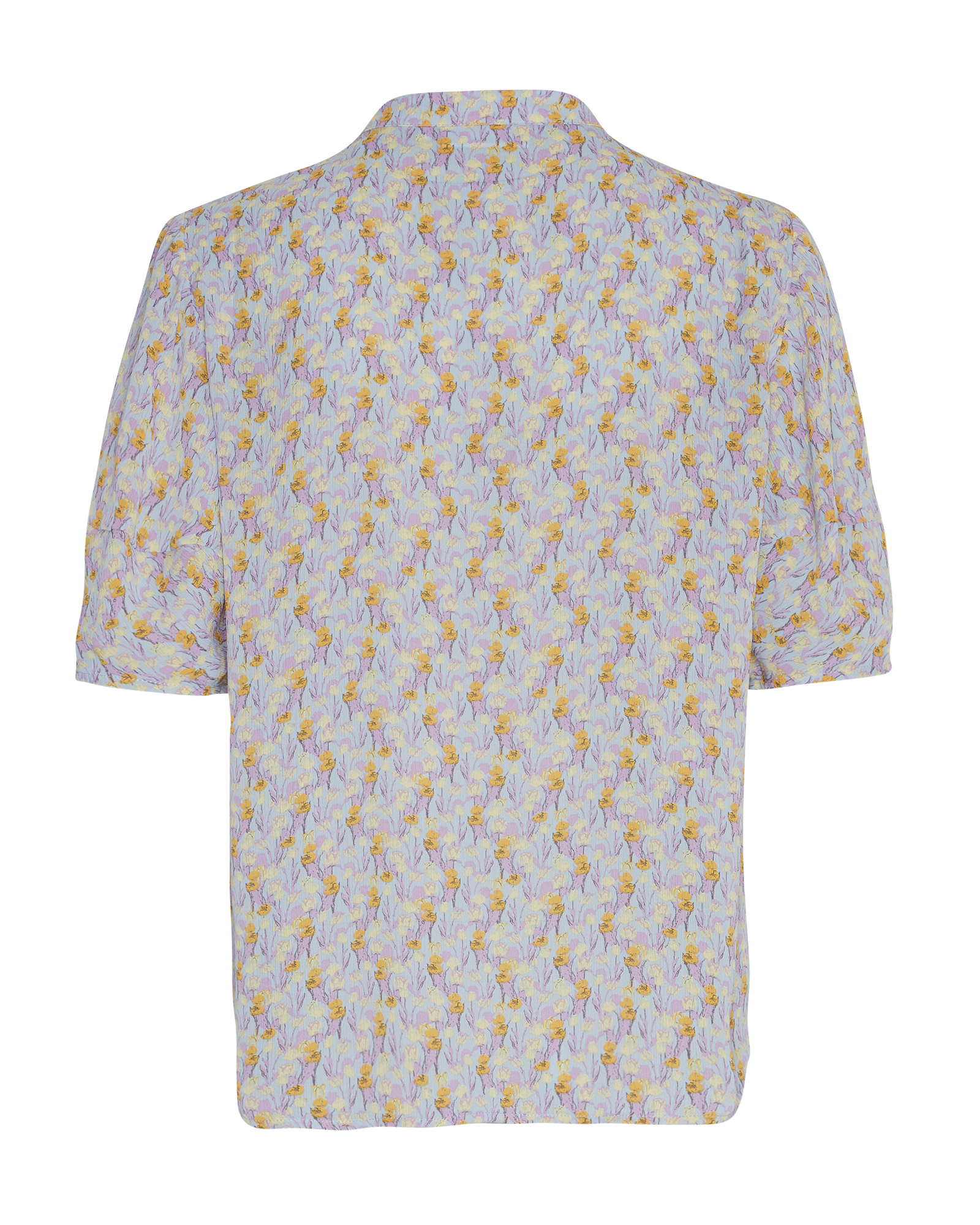 Smuk skjortebluse i et let og luftig kvalitet. Blusen er syet i en kvalitet med genanvendt polyester og et sødt lyseblåt print med lilla orange og cremefarvede blomster. Den har korte ærmer og løs pasform med knapper ved brystet.
