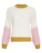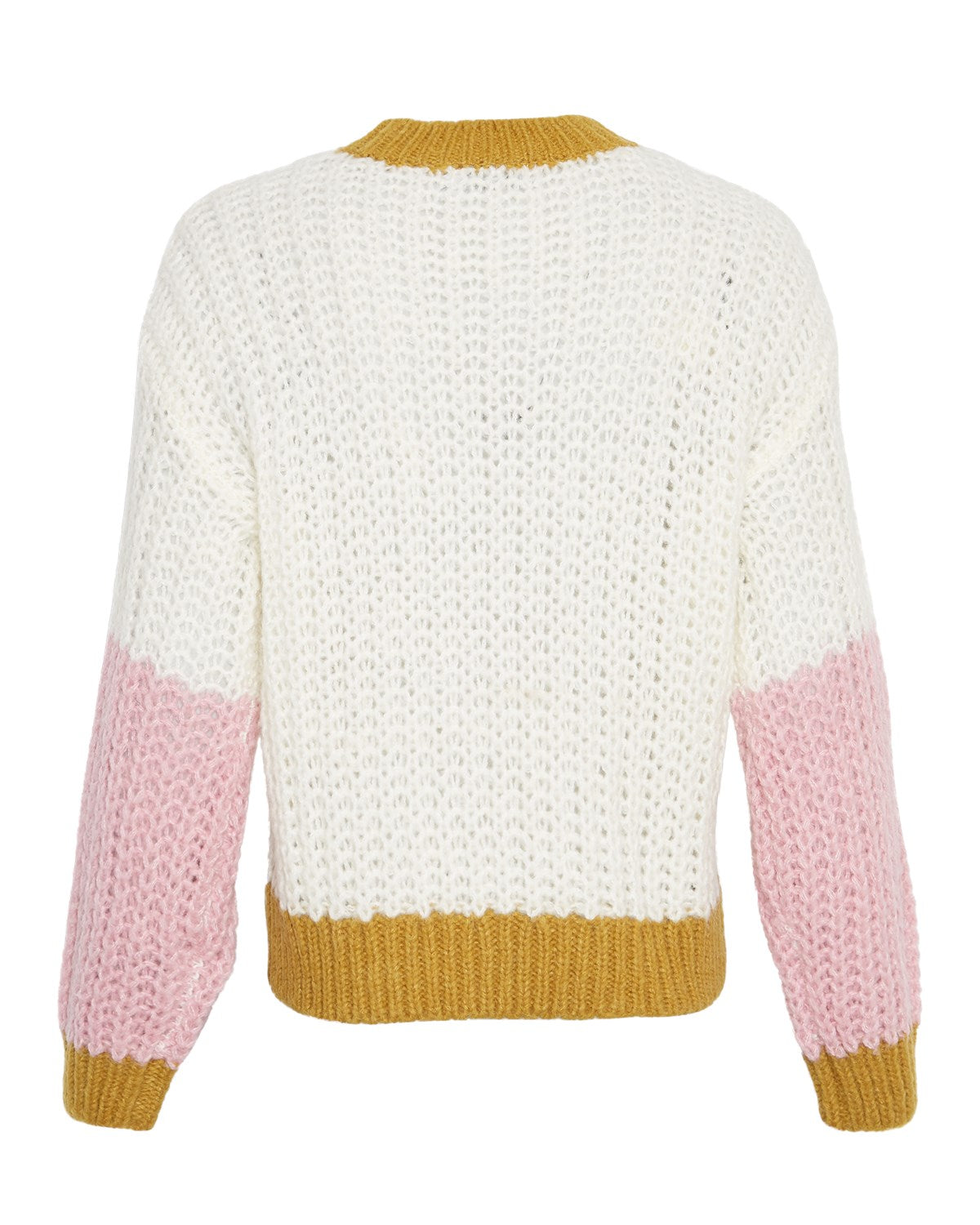 Super fin strikketrøje med nogle skønne farvekombinationer. Inari er i et hulmønster, har rund og lange ærmer med ribstrik i bunden.
