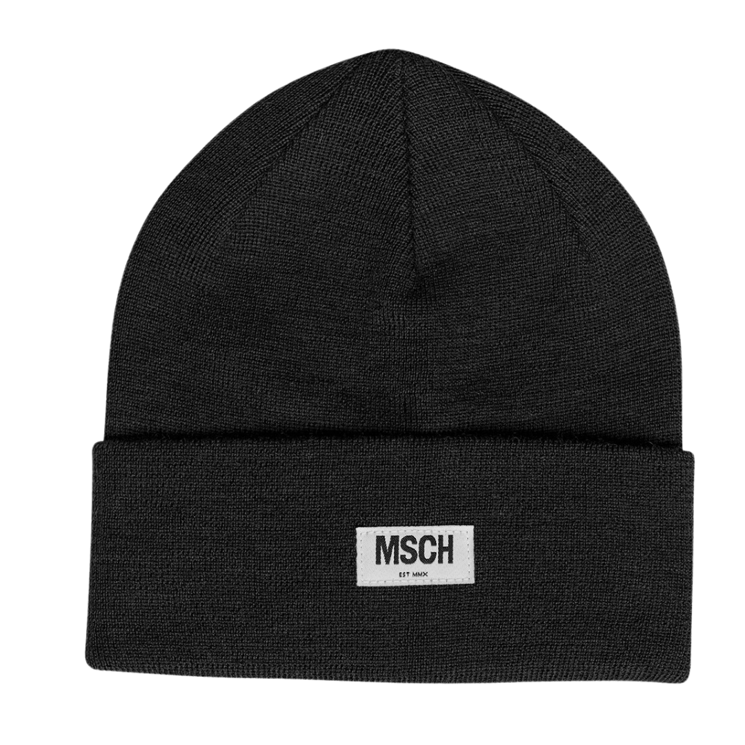 Lækker og behagelig hue fra Moss Copenhagens i en klassisk sort farve, med logo foran. Se huen i andre farver her.